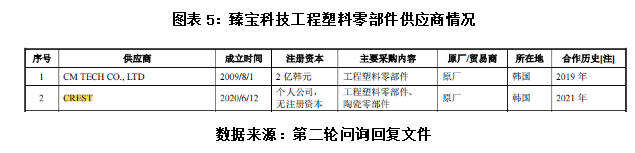 据第二轮问询回复文件显示,CREST是韩国CM TECH前员工成立的“个人公司”,无注册资本,2020年6月才正式成立,而次年便与臻宝科技建立了合作关系,并自2024年起成为臻宝科技工程塑料零部件业务的独家供应商。