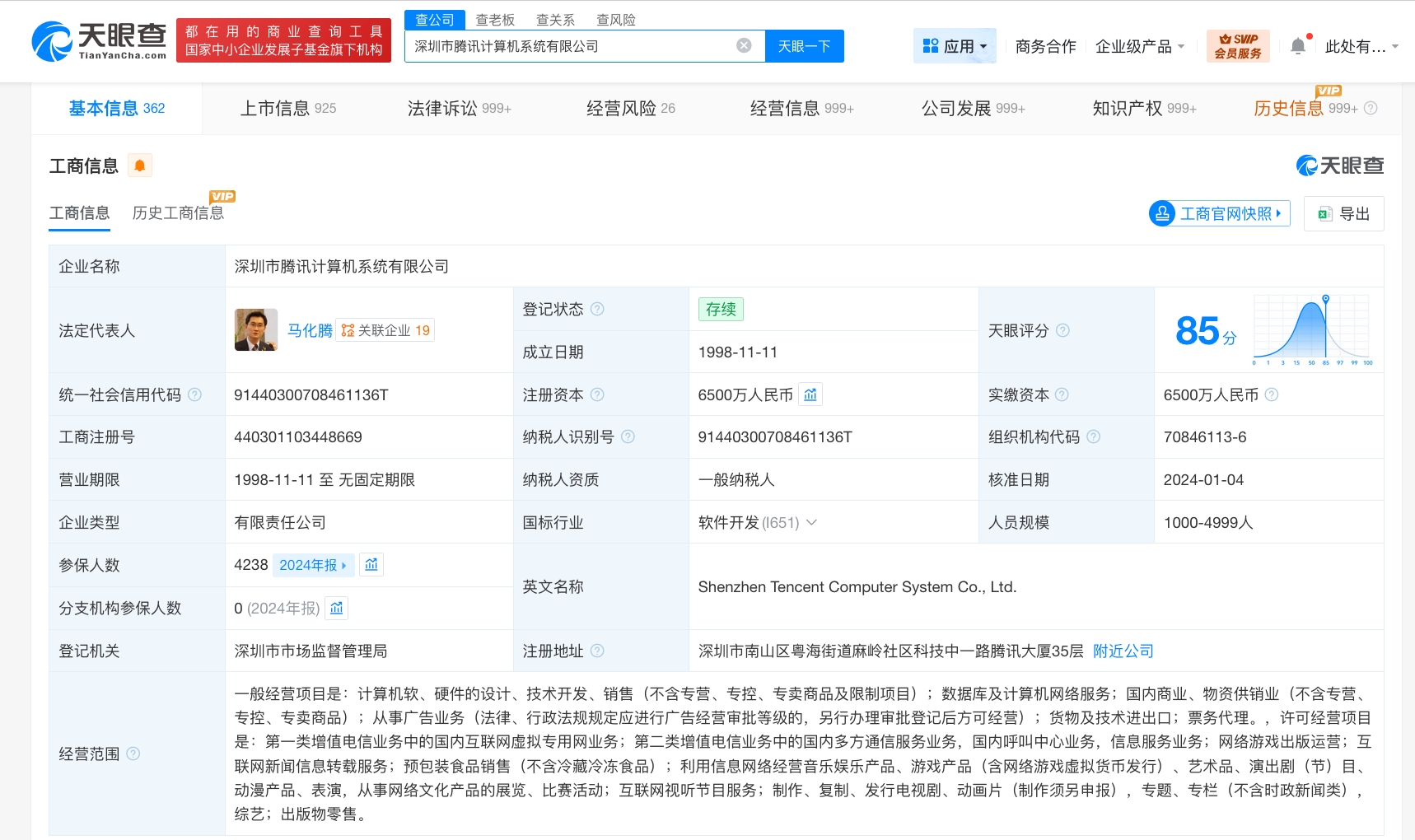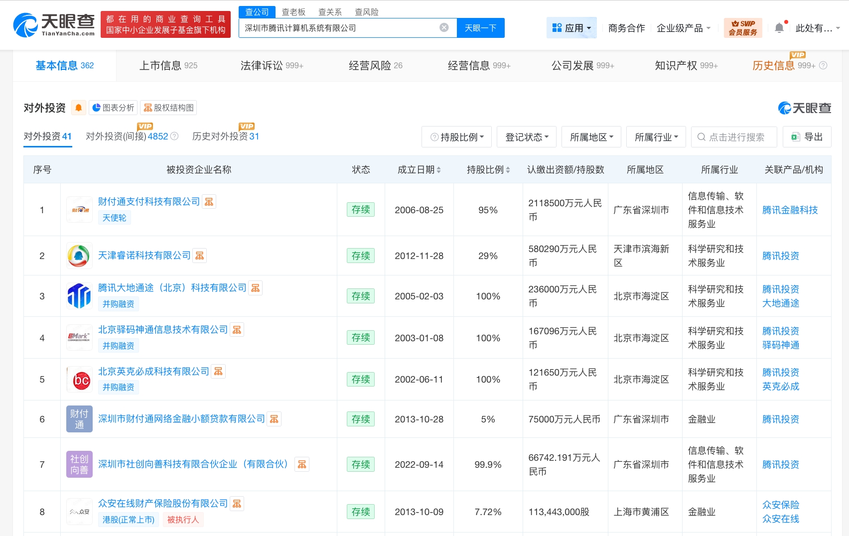 天眼查工商信息显示,腾讯关联公司深圳市腾讯计算机系统有限公司成立于1998年11月,法定代表人为马化腾,注册资本6500万人民币。股东信息显示,该公司由马化腾、张志东、陈一丹、许晨晔共同持股。对外投资信息显示,该公司直接持股40余家企业,其中30余家为存续状态,包括财付通支付科技有限公司、腾讯大地通途(北京)科技有限公司、北京驿码神通信息技术有限公司、北京英克必成科技有限公司等。