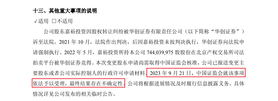 此时嘉裕投资的核心资产正是其持有的7.44亿股太平洋证券股份,占总股本10.92%。2022年5月,北京二中院对该股份进行公开拍卖,评估价22.58亿元,起拍价17.26亿元,较评估价打了八折。此次拍卖,仅有华创证券参与竞拍,最终竞得该部分股权。