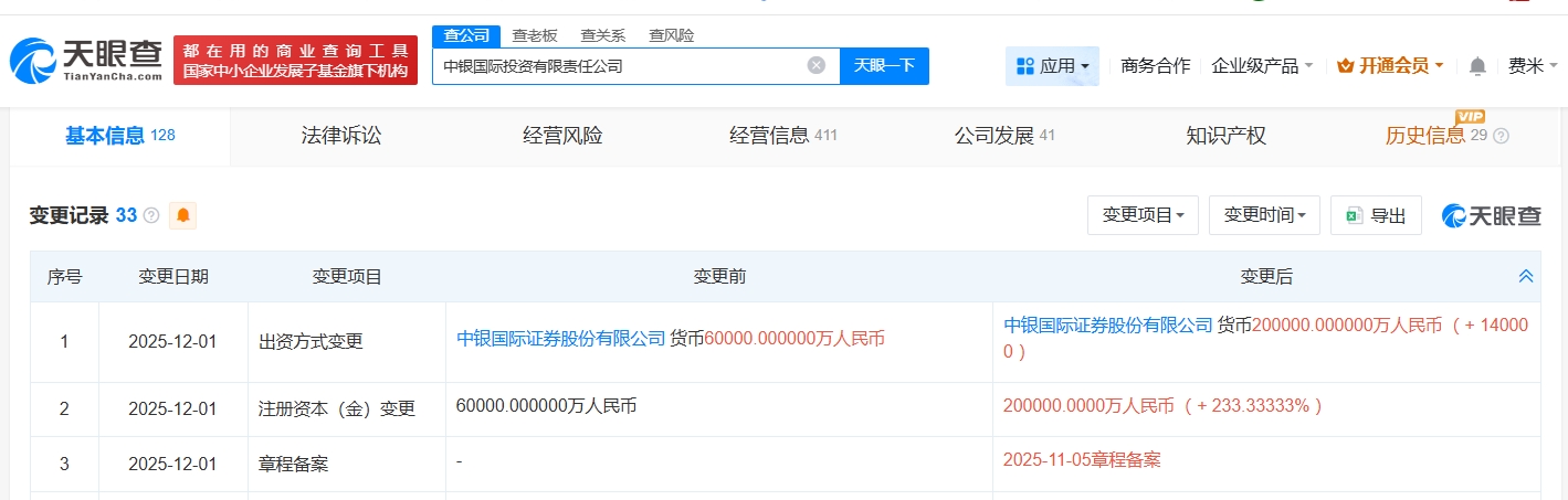 雷达财经讯,天眼查工商信息显示,近日,中银国际投资有限责任公司发生工商变更,注册资本由6亿人民币增至20亿人民币,增幅约233%。