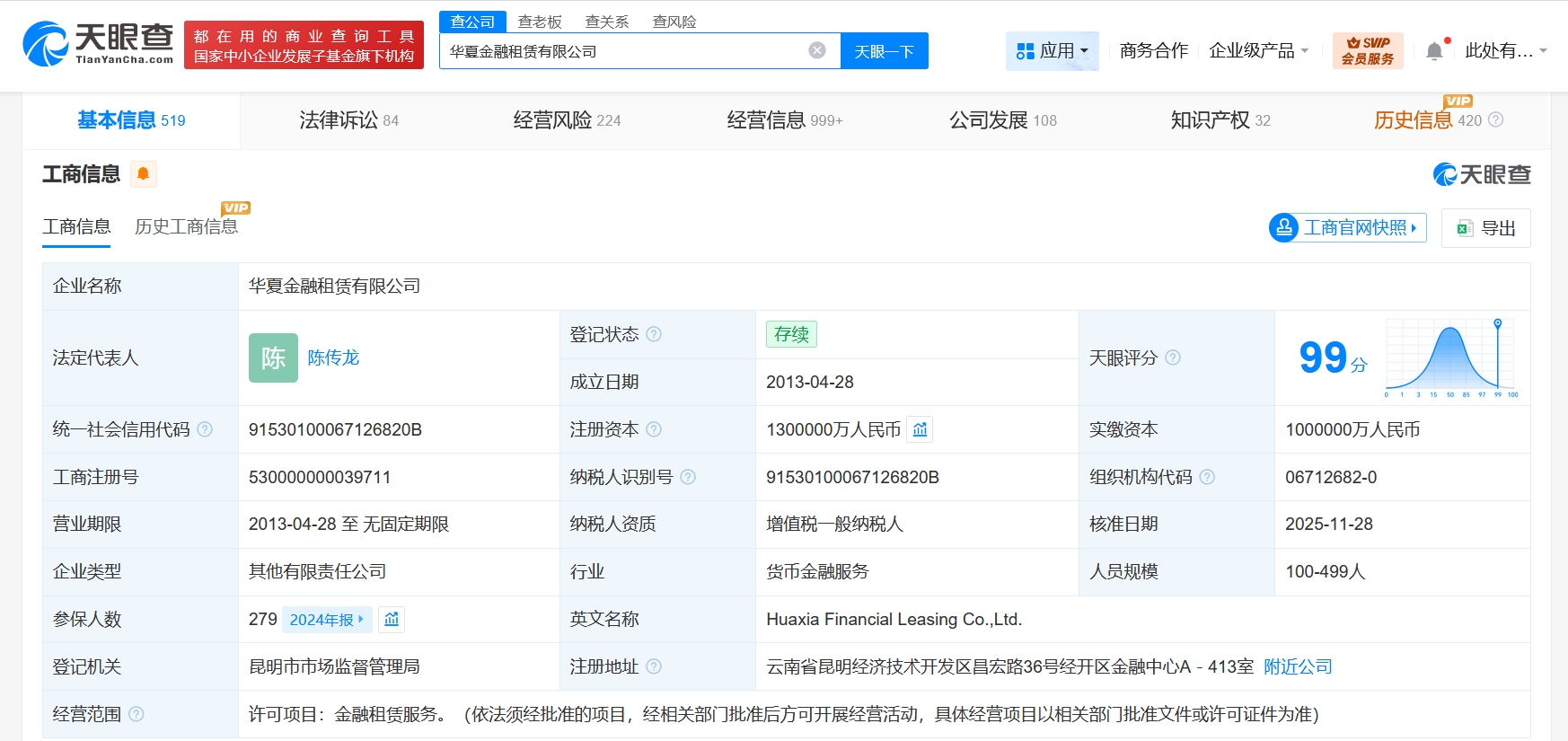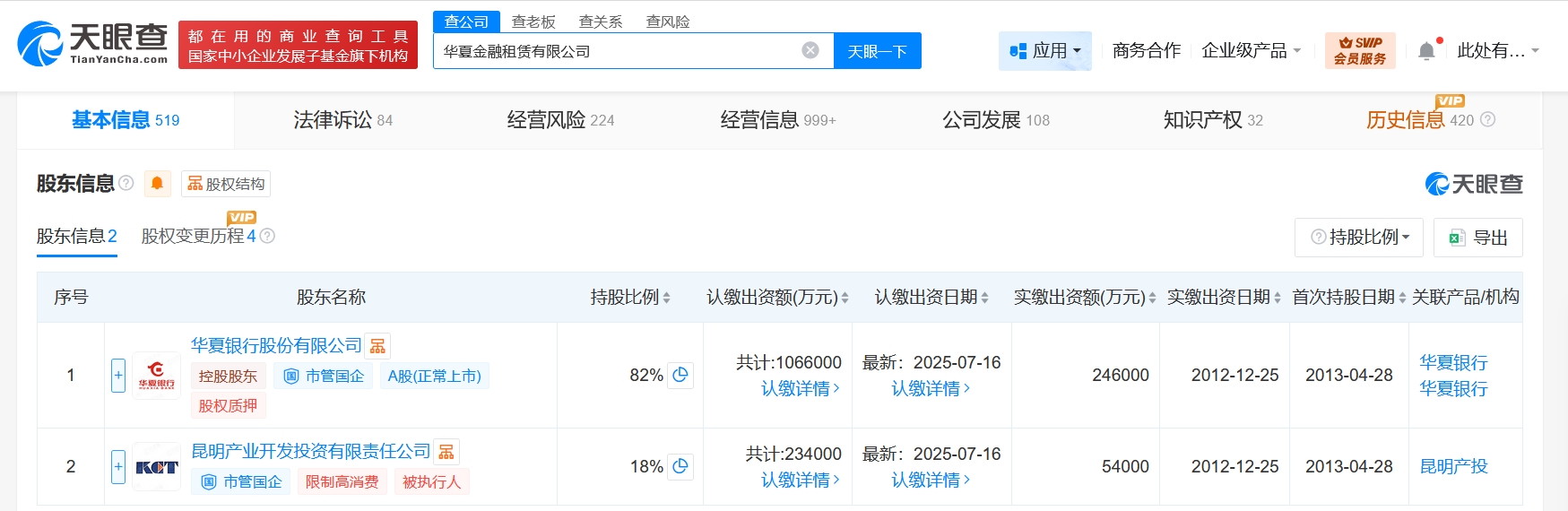 该公司成立于2013年4月,法定代表人为陈传龙,经营范围为金融租赁服务。股东信息显示,该公司由华夏银行(600015)、昆明产业开发投资有限责任公司分别持股82%、18%。