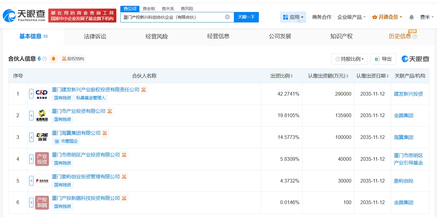 雷达财经讯,天眼查工商信息显示,近日,厦门产投新兴科创合伙企业(有限合伙)成立,出资额68.6亿人民币,经营范围为科技推广和应用服务、以自有资金从事投资活动、自有资金投资的资产管理服务、信息咨询服务。合伙人信息显示,该合伙企业由厦门建发新兴产业股权投资有限责任公司、厦门市产业投资有限公司、厦门海翼集团有限公司等共同出资。
