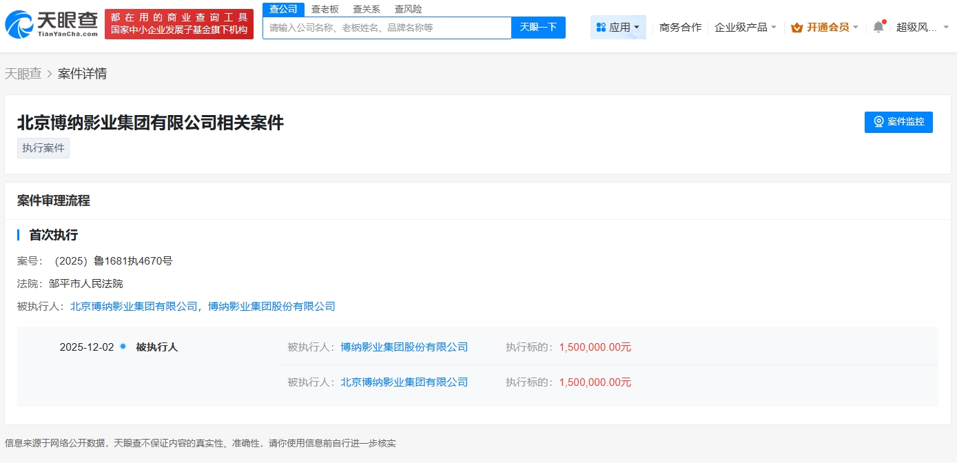 雷达财经讯,天眼查天眼风险信息显示,近日,博纳影业集团股份有限公司、北京博纳影业集团有限公司新增1条被执行人信息,执行标的150万元,执行法院为邹平市人民法院。