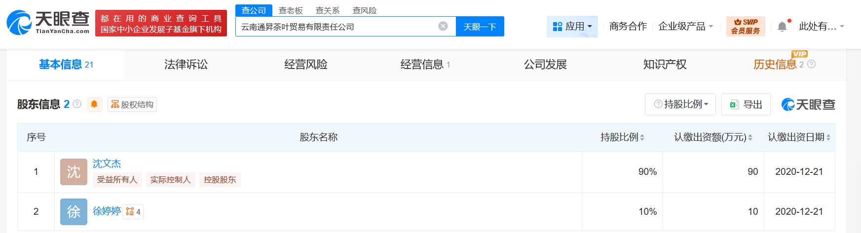 天眼查工商信息显示,云南通昇茶叶贸易有限责任公司成立于2020年12月,法定代表人为徐庆梅,注册资本100万人民币,经营范围含酒、饮料及茶叶的销售,茶叶包装设计等。股东信息显示,该公司由沈文杰、徐婷婷分别持股90%、10%。值得一提的是,2024年年报信息显示,该公司职工基本医疗保险参保人数为5人,生育保险、工伤保险、城镇职工基本养老保险、失业保险参保人数均为0。