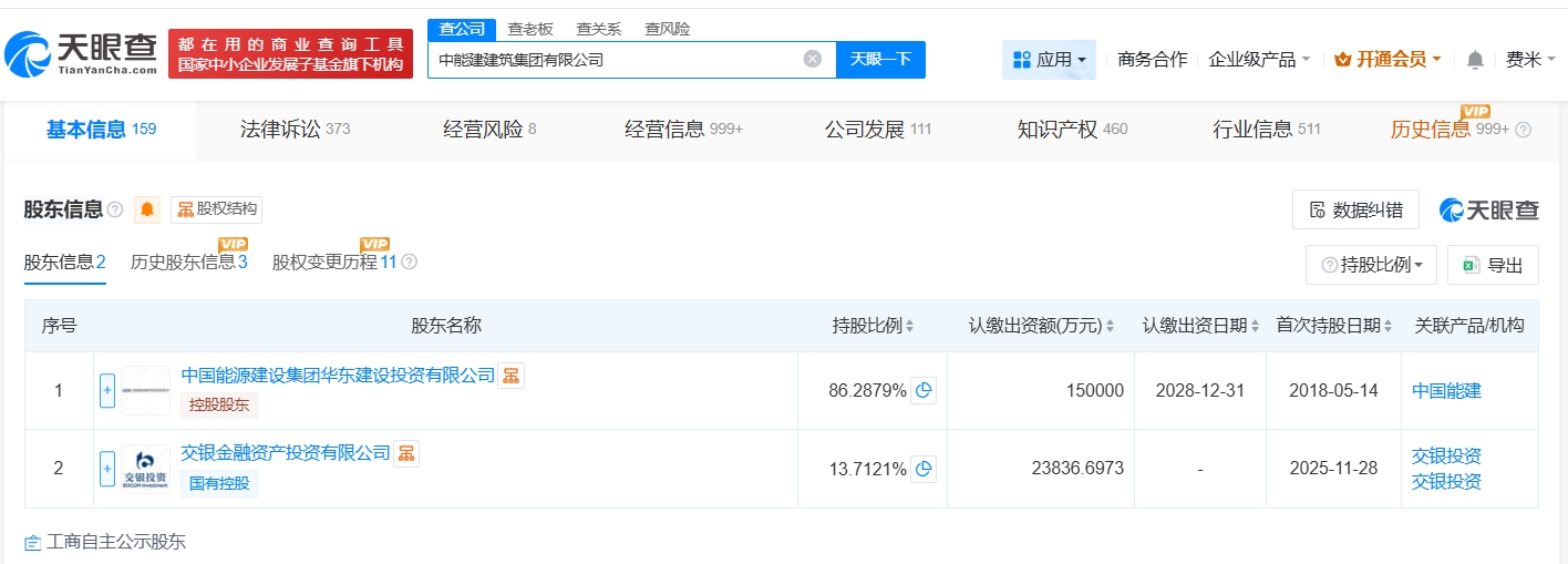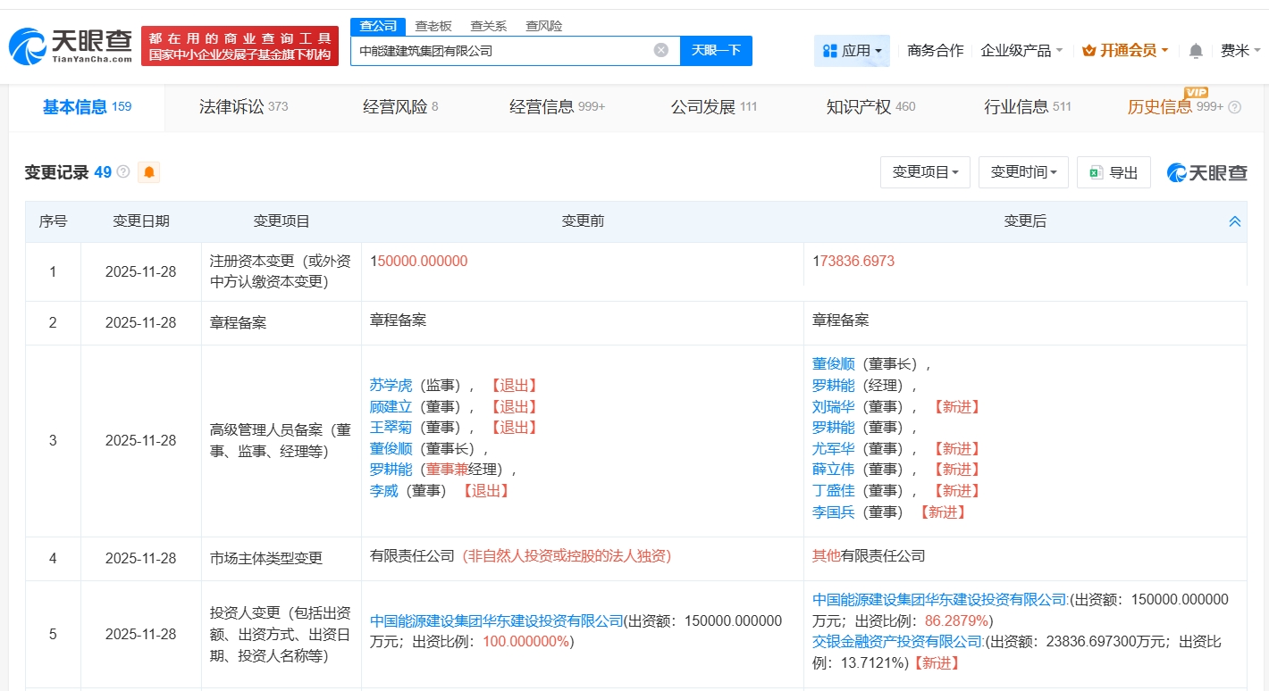 雷达财经讯,天眼查工商信息显示,近日,中能建建筑集团有限公司发生工商变更,新增交银金融资产投资有限公司为股东,注册资本由15亿人民币增至约17.4亿人民币,增幅约16%,同时,多位主要人员发生变更。