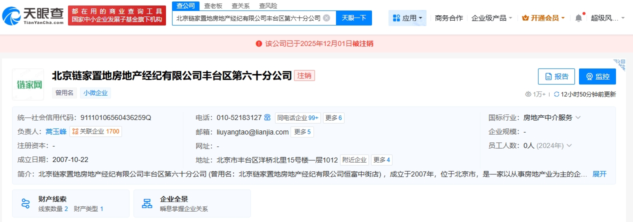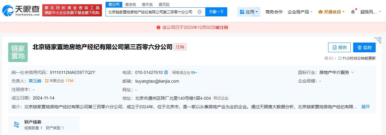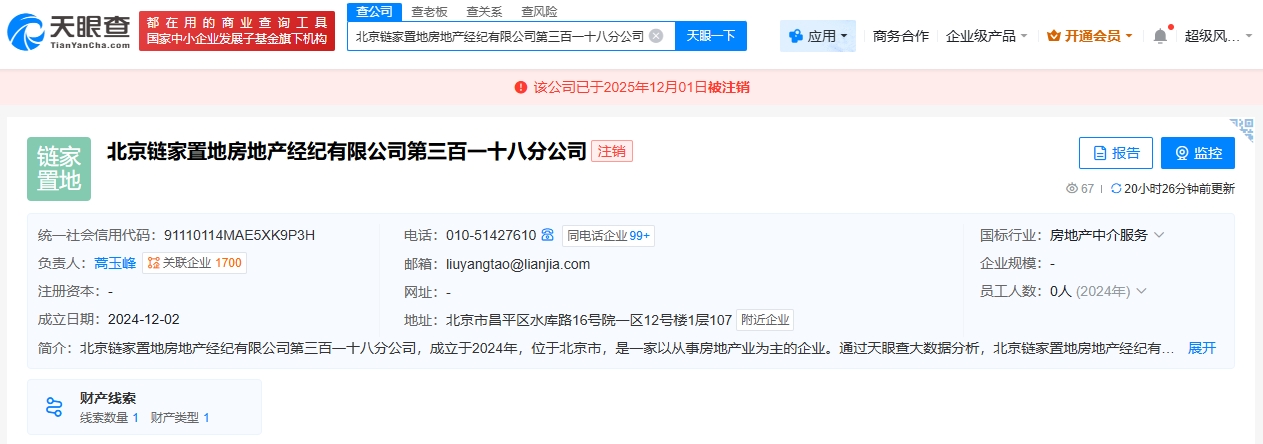 雷达财经讯,天眼查App显示,近日,北京链家置地房地产经纪有限公司丰台区第六十分公司、北京链家置地房地产经纪有限公司第三百零六分公司、北京链家置地房地产经纪有限公司第三百一十八分公司、北京链家置地房地产经纪有限公司顺义第八十八分公司、北京链家置地房地产经纪有限公司丰台第六十三分公司登记状态由存续变更为注销,负责人均为蒿玉峰,注销原因为隶属(派出)企业终止。