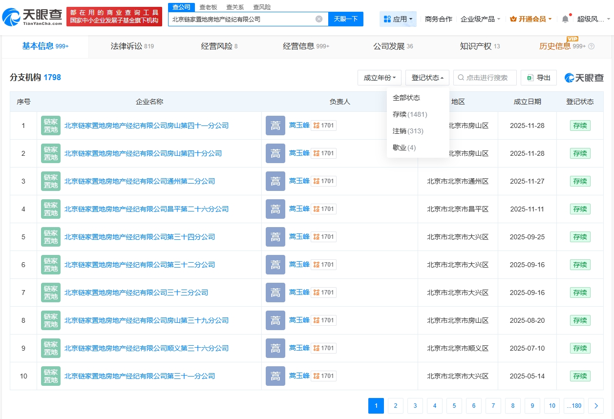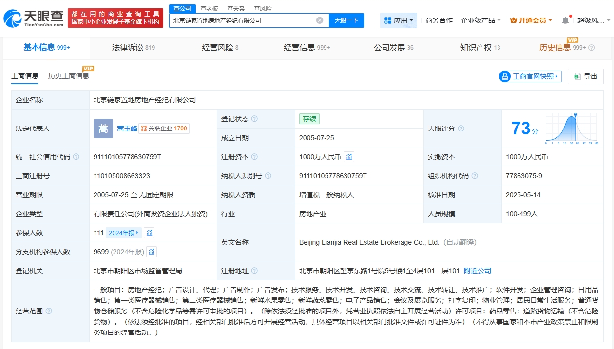 北京链家置地房地产经纪有限公司成立于2005年7月,法定代表人为蒿玉峰,注册资本1000万人民币,经营范围包括房地产经纪、企业管理咨询、日用品销售等,由链家(天津)企业管理有限公司全资持股。分支机构信息显示,该公司拥有近1800家分支机构,其中300余家分公司已注销。