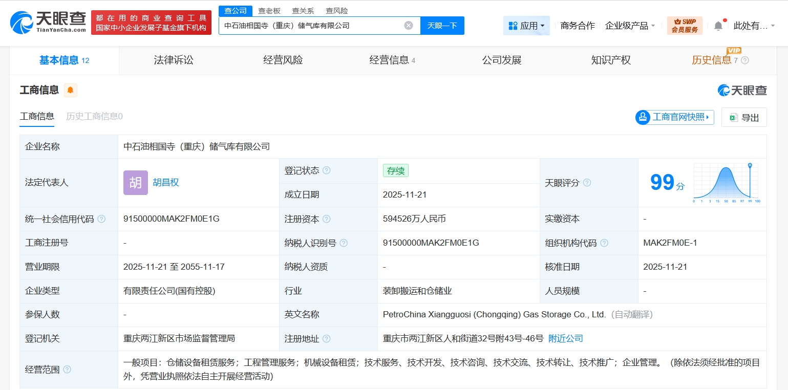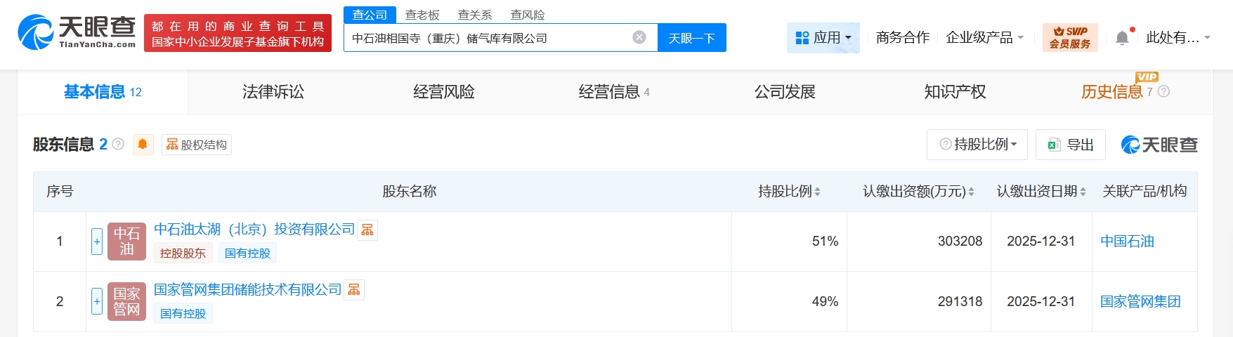 雷达财经讯,天眼查工商信息显示,近日,中石油相国寺(重庆)储气库有限公司成立,法定代表人为胡昌权,注册资本约59.45亿人民币,经营范围为仓储设备租赁服务,工程管理服务,机械设备租赁,技术服务、技术开发、技术咨询、技术交流、技术转让、技术推广,企业管理。股东信息显示,该公司由中石油太湖(北京)投资有限公司、国家管网集团储能技术有限公司分别持股51%、49%。