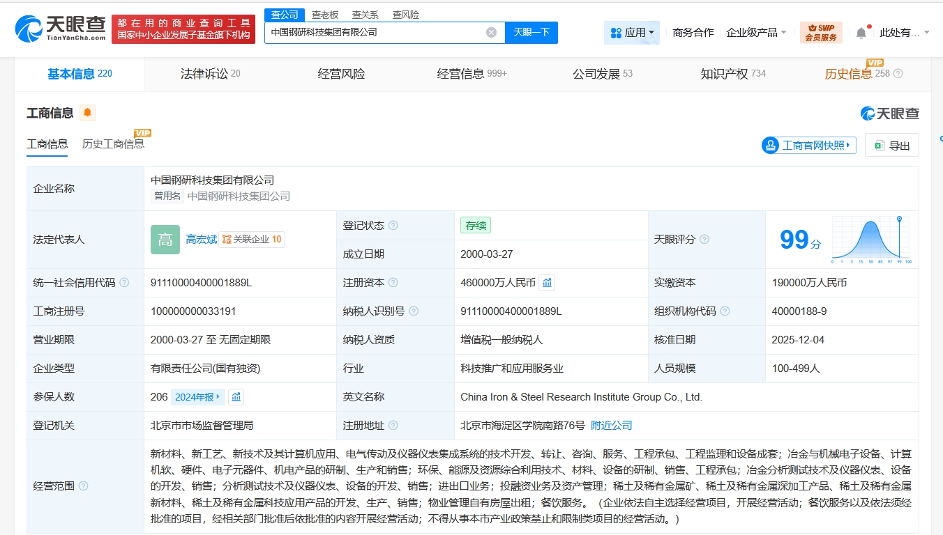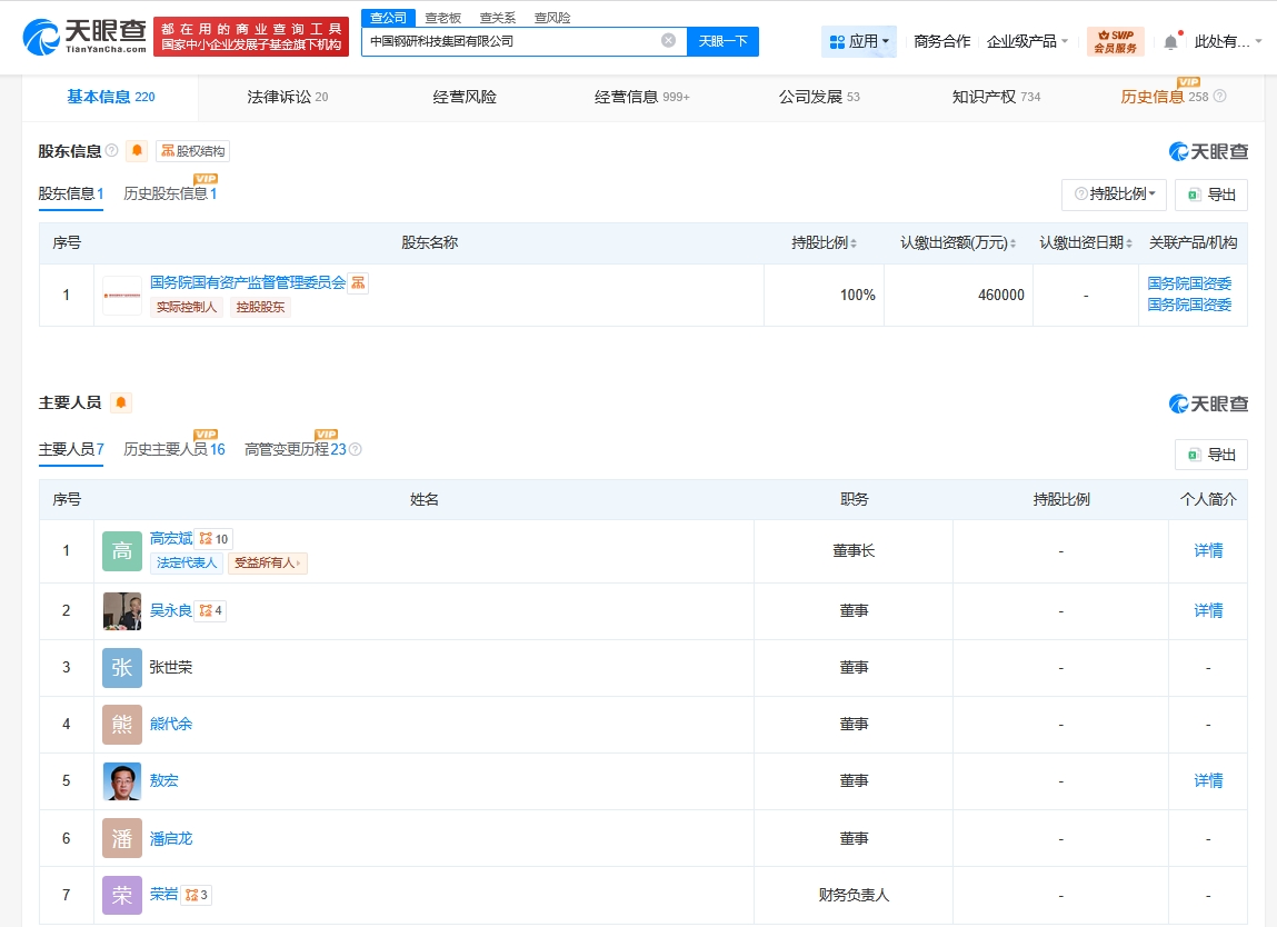 中国钢研科技集团有限公司成立于2000年3月,经营范围含新材料、新工艺、新技术及其计算机应用、电气传动及仪器仪表集成系统的技术开发、转让、咨询、服务、工程承包、工程监理和设备成套等。股东信息显示,该公司由国务院国有资产监督管理委员会全资持股。
