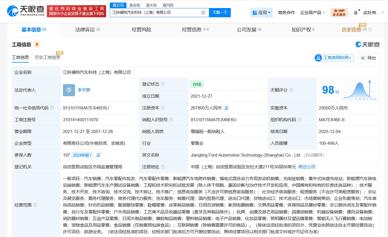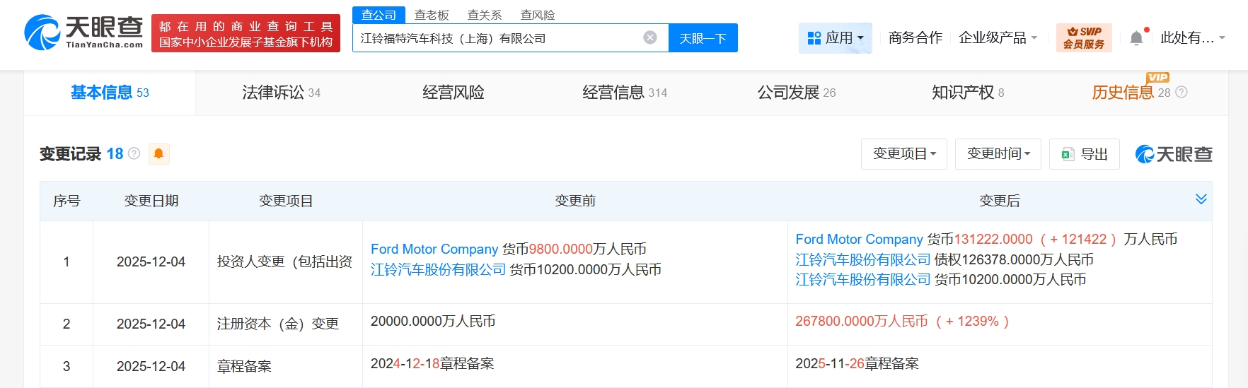 雷达财经讯,天眼查工商信息显示,近日,江铃福特汽车科技(上海)有限公司发生工商变更,注册资本由2亿人民币增至26.78亿人民币,增幅1239%。