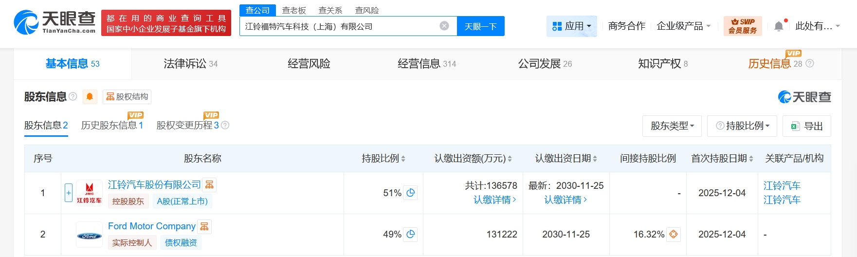 该公司成立于2021年12月,法定代表人为李平晖,经营范围含汽车销售、汽车零配件批发、汽车零配件零售、新能源汽车电附件销售、插电式混合动力专用发动机销售、充电桩销售、集中式快速充电站、新能源汽车换电设施销售、新能源汽车生产测试设备销售、工程和技术研究和试验发展等。股东信息显示,该公司由江铃汽车(000550)、Ford Motor Company分别持股51%、49%。