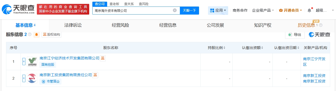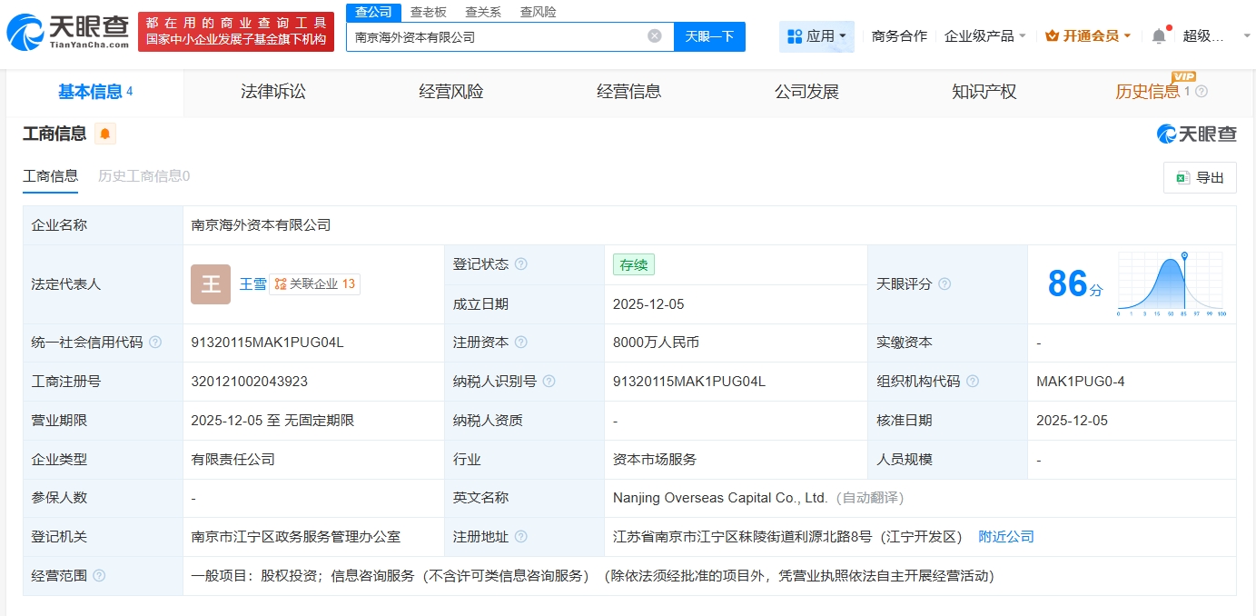 雷达财经讯,天眼查App显示,近日,南京海外资本有限公司成立,法定代表人为王雪,注册资本8000万人民币,经营范围包括股权投资、信息咨询服务。股东信息显示,该公司由南京江宁经济技术开发集团有限公司、南京新工投资集团有限责任公司共同持股。