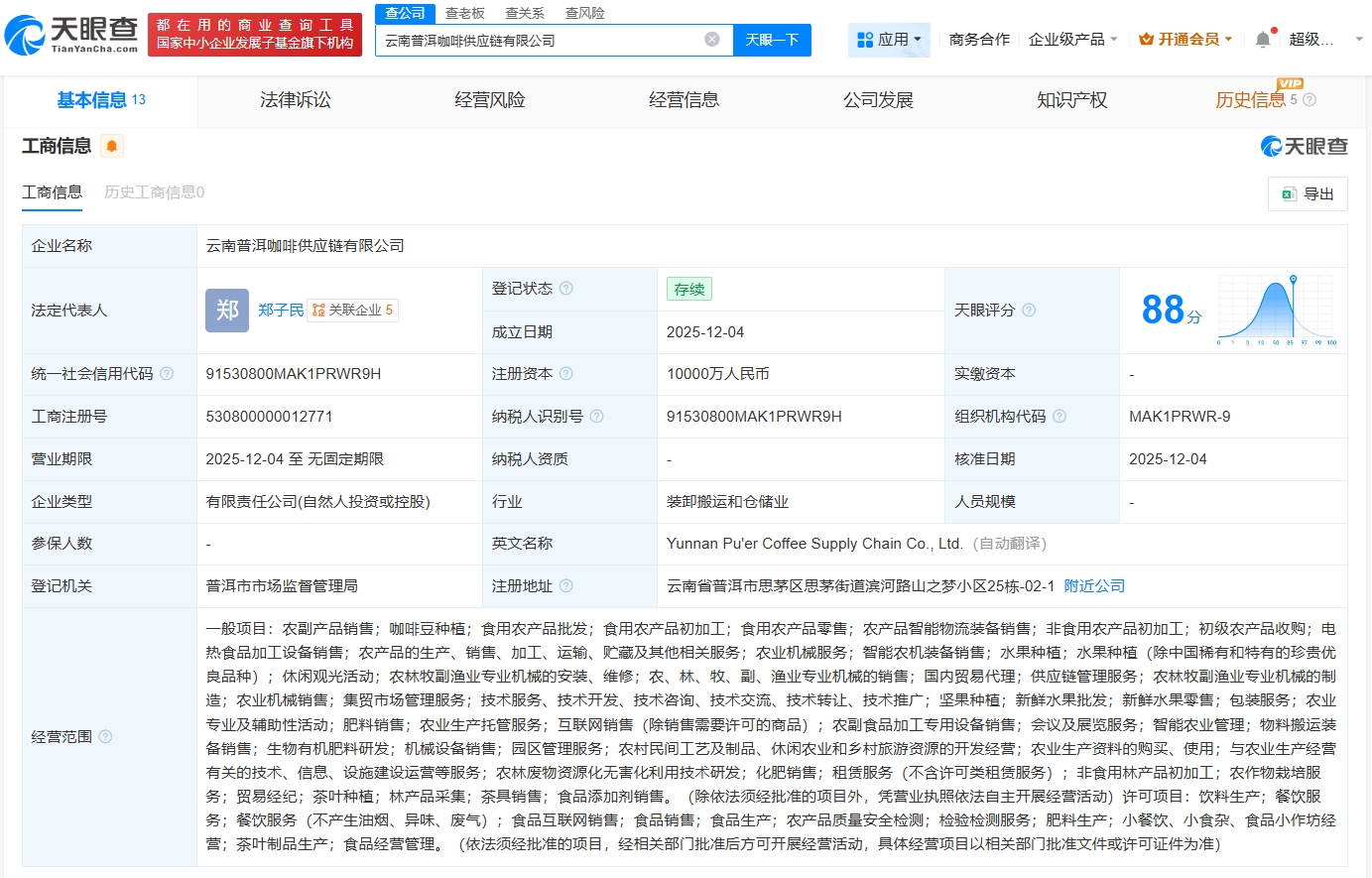 雷达财经讯,天眼查App显示,近日,云南普洱咖啡供应链有限公司成立,法定代表人为郑子民,注册资本1亿人民币,经营范围包括农副产品销售、咖啡豆种植、食用农产品批发、食用农产品初加工等。股东信息显示,该公司由云南咖啡产业股权投资基金合伙企业(有限合伙)、正大(普洱)咖啡有限公司、云南兴昂实业(集团)有限公司共同持股。