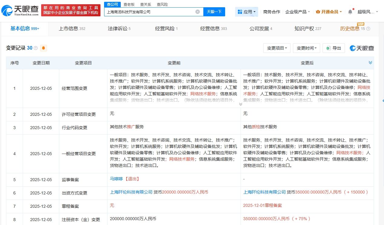 雷达财经讯,天眼查App显示,近日,上海商汤科技开发有限公司发生工商变更,注册资本由20亿人民币增至35亿人民币,增幅75%。