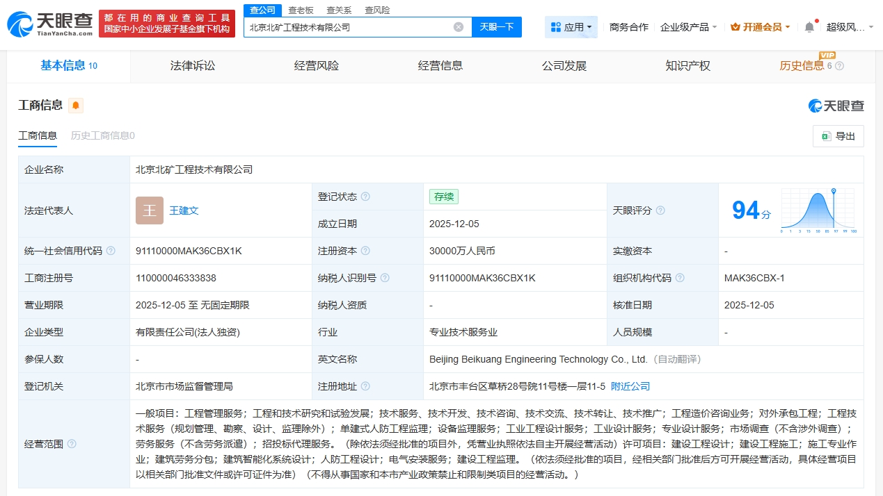 雷达财经讯,天眼查App显示,近日,北京北矿工程技术有限公司成立,法定代表人为王建文,注册资本3亿人民币,经营范围包括工程管理服务、工程和技术研究和试验发展、建筑智能化系统设计等。股东信息显示,该公司由矿冶科技集团有限公司全资持股。