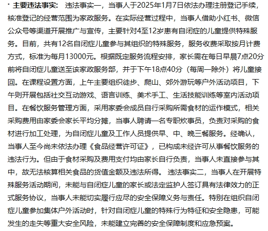 处罚事由显示,当事人成立于2025年1月,核准登记的经营范围为家政服务。在实际经营过程中,主要针对4至12岁患有自闭症的儿童提供特殊服务,并提供早、中、晚三餐服务,构成未经许可从事餐饮服务的违法行为。同时,当事人在开展特殊服务活动期间,未能与家长或法定监护人签订具有法律效力的正式服务协议,未能切实履行应尽的责任。户外活动时,针对自闭症儿童的特殊行为特征和安全隐患,可能发生的走失等重大安全风险,未能建立完善的安全保障制度和应急预案。