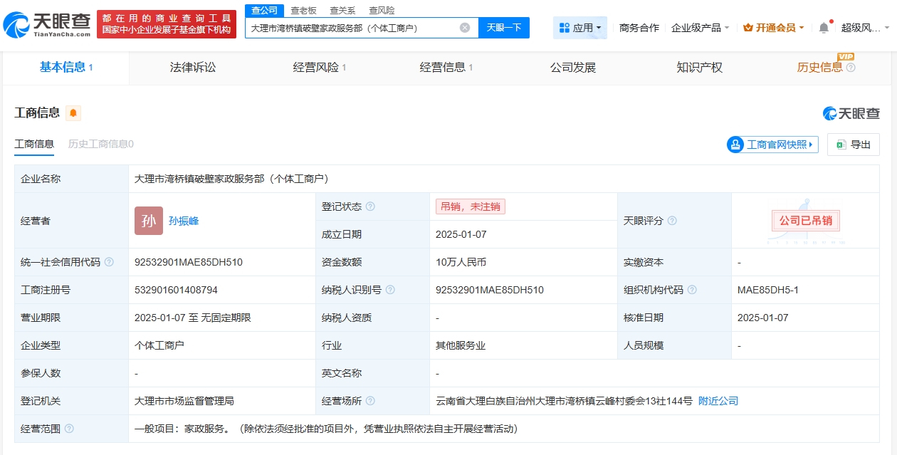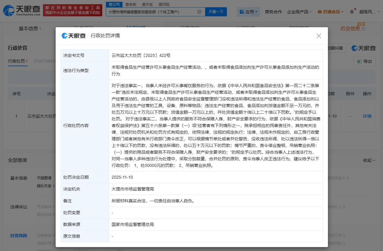 天眼查天眼风险信息显示,近期,大理市湾桥镇破壁家政服务部(个体工商户)因未取得食品生产经营许可从事食品生产经营活动、未能建立完善的安全保障制度和应急预案,被大理市市场监督管理局罚款5万元,并吊销营业执照。