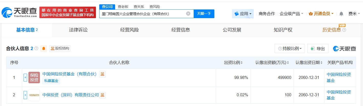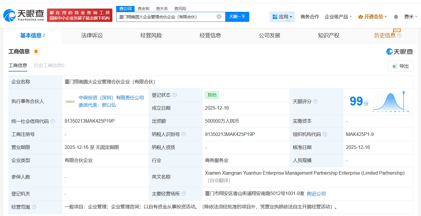 雷达财经讯,天眼查App显示,12月16日,厦门翔南圆火企业管理合伙企业(有限合伙)成立,执行事务合伙人为中保投资(深圳)有限责任公司,出资额50亿人民币,经营范围为企业管理、企业管理咨询、以自有资金从事投资活动,由中国保险投资基金(有限合伙)、中保投资(深圳)有限责任公司共同出资。