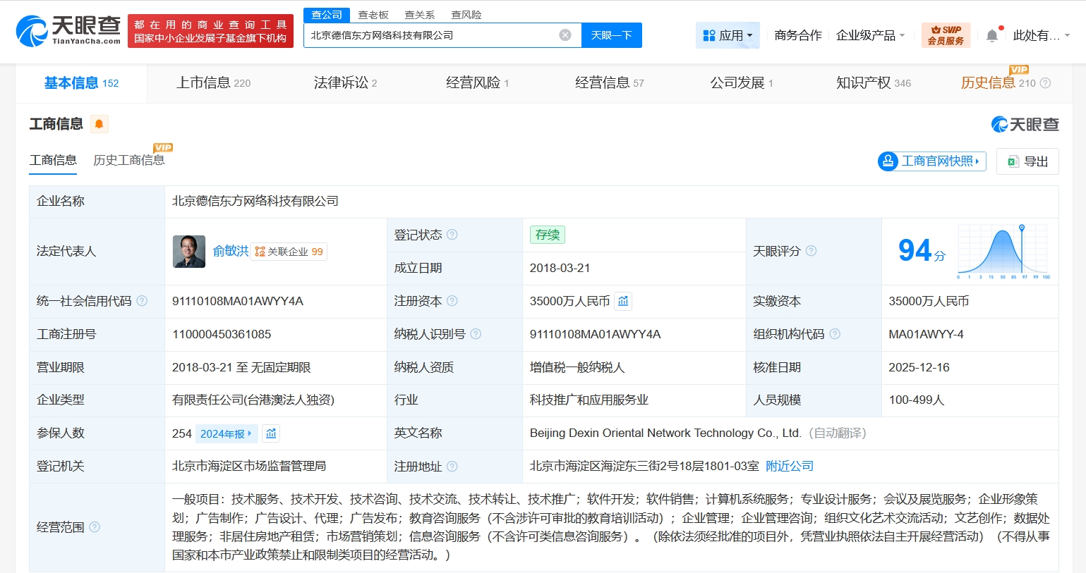 北京德信东方网络科技有限公司成立于2018年3月,注册资本3.5亿人民币,经营范围含软件开发、软件销售、计算机系统服务、专业设计服务、会议及展览服务、教育咨询服务、企业管理、组织文化艺术交流活动等。股东信息显示,该公司由新东方迅程科技(香港)有限公司全资持股。值得一提的是,此前,孙东旭已卸任东方甄选(北京)科技有限公司职务。