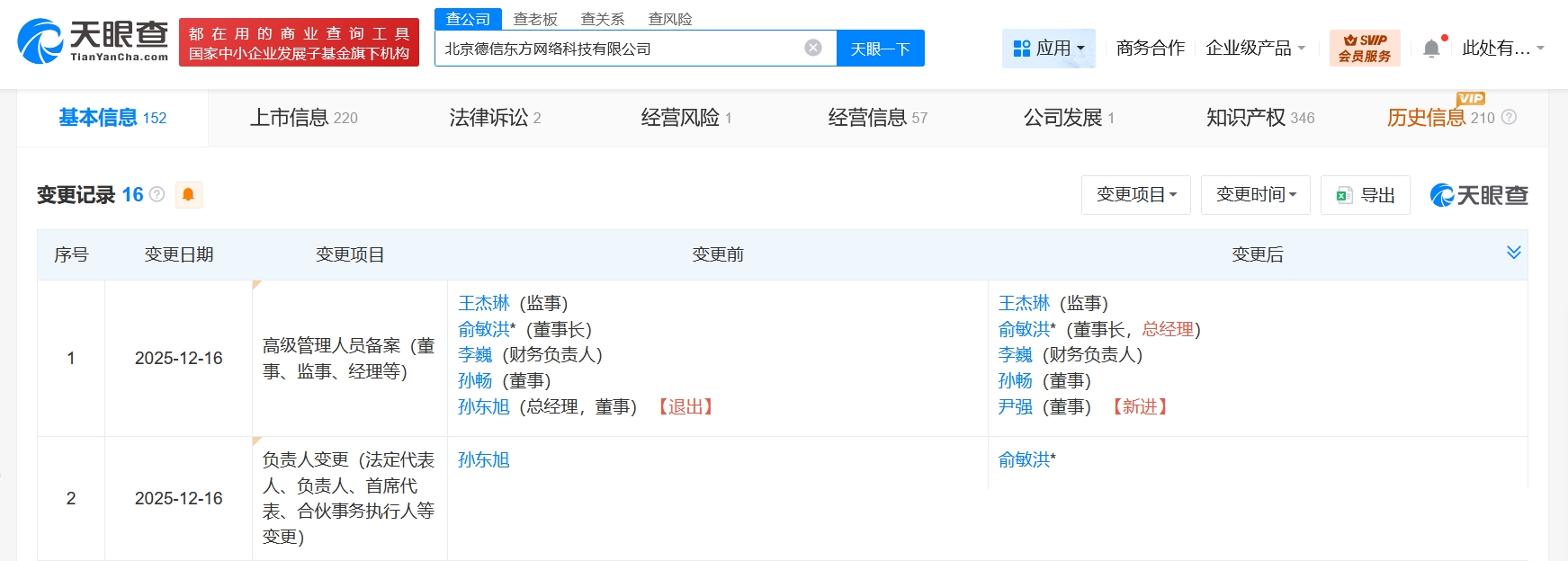雷达财经讯,天眼查工商信息显示,近日,北京德信东方网络科技有限公司发生工商变更,孙东旭卸任法定代表人、总经理、董事,由俞敏洪接任法定代表人、总经理,新增尹强为董事。
