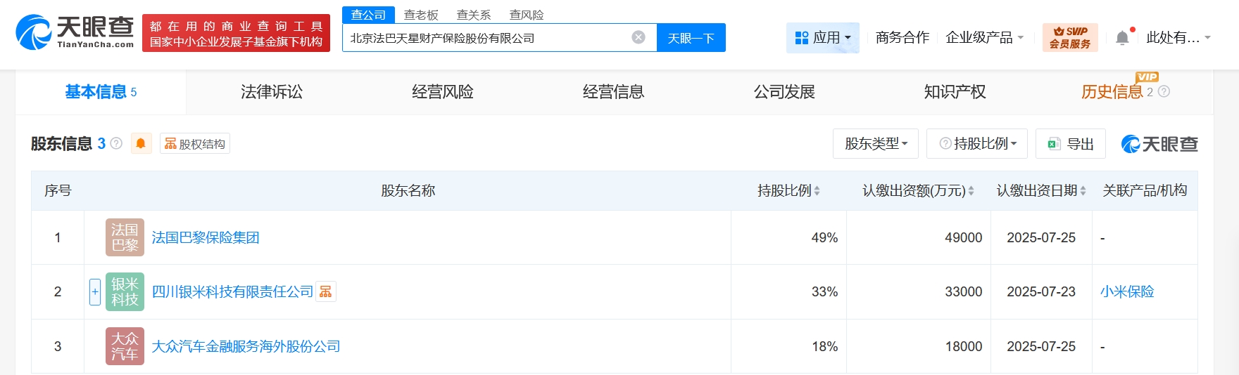 雷达财经讯,天眼查工商信息显示,12月16日,北京法巴天星财产保险股份有限公司成立,注册资本10亿人民币,经营范围为保险业务。股东信息显示,该公司由法国巴黎保险集团、四川银米科技有限责任公司、大众汽车金融服务海外股份公司分别持股49%、33%、18%。