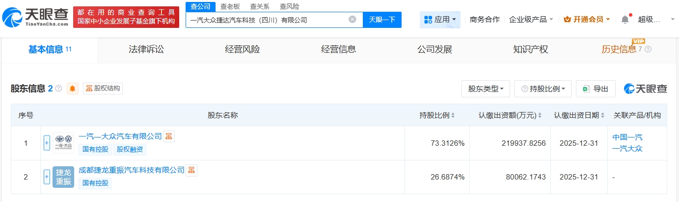 雷达财经讯,天眼查工商信息显示,近日,一汽大众捷达汽车科技(四川)有限公司成立,法定代表人为聂强,注册资本30亿人民币,经营范围包括汽车零部件及配件制造、电动机制造、智能车载设备制造、道路机动车辆生产等。股东信息显示,该公司由一汽—大众汽车有限公司、成都捷龙重振汽车科技有限公司共同持股。