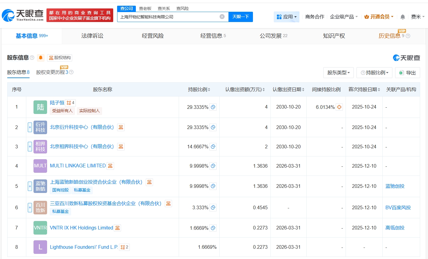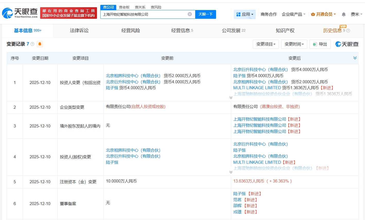 雷达财经讯,天眼查App显示,近日,上海开物纪智能科技有限公司发生工商变更,新增百度旗下三亚百川致新私募股权投资基金合伙企业(有限合伙)、上海蓝驰新皓创业投资合伙企业(有限合伙)等为股东,注册资本由10万人民币增至约13.6万人民币,同时,多位高管发生变更。