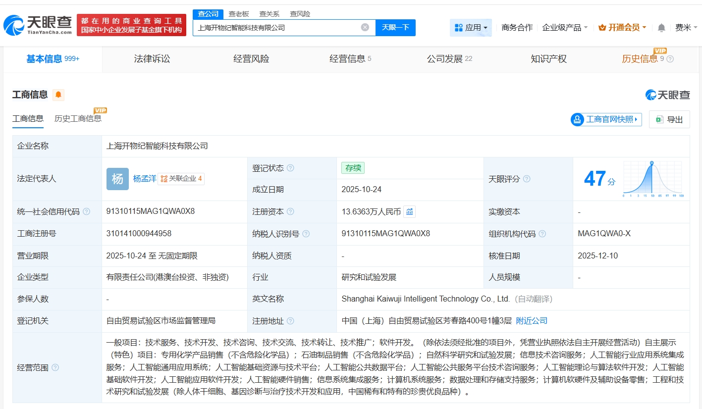 该公司成立于今年10月,法定代表人为杨孟洋,经营范围包括人工智能行业应用系统集成服务、人工智能通用应用系统、人工智能基础资源与技术平台等,现由陆子恒、北京衍升科技中心(有限合伙)及上述新增股东等共同持股。公开资料显示,该公司是一家人工智能技术驱动材料研发商。
