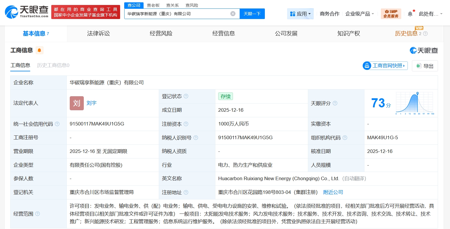天眼查App显示,近日,华碳瑞享新能源(重庆)有限公司成立,法定代表人为刘宇,注册资本1000万人民币,经营范围含发电业务、输电业务、供(配)电业务,太阳能发电技术服务,风力发电技术服务,新兴能源技术研发,工程管理服务,信息系统运行维护服务…