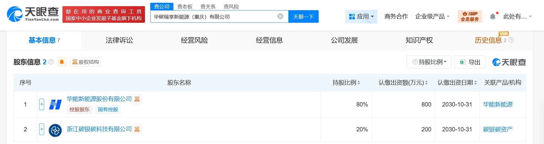 华能新能源等在重庆成立华碳瑞享公司 注册资本1000万