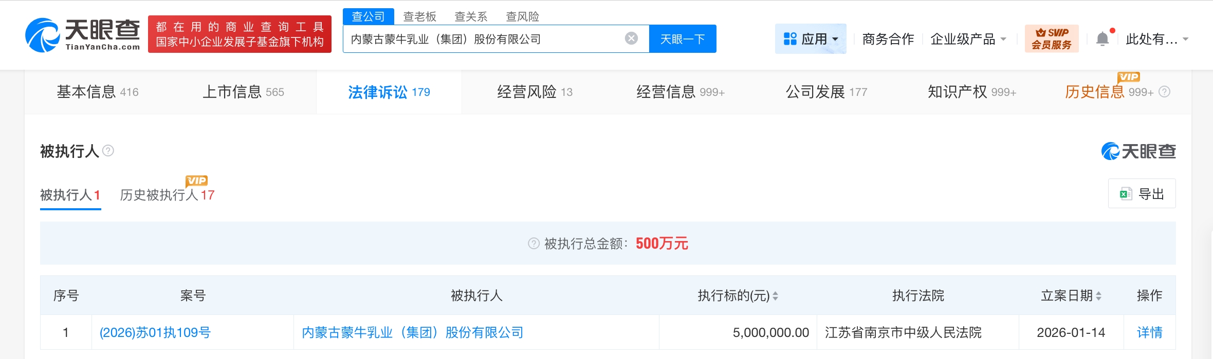 雷达财经讯,天眼查天眼风险信息显示,近日,内蒙古蒙牛乳业(集团)股份有限公司新增一则被执行人信息,执行标的500万人民币,执行法院为江苏省南京市中级人民法院。