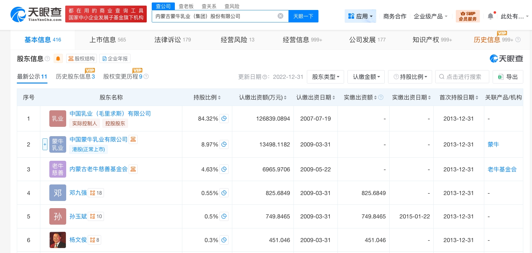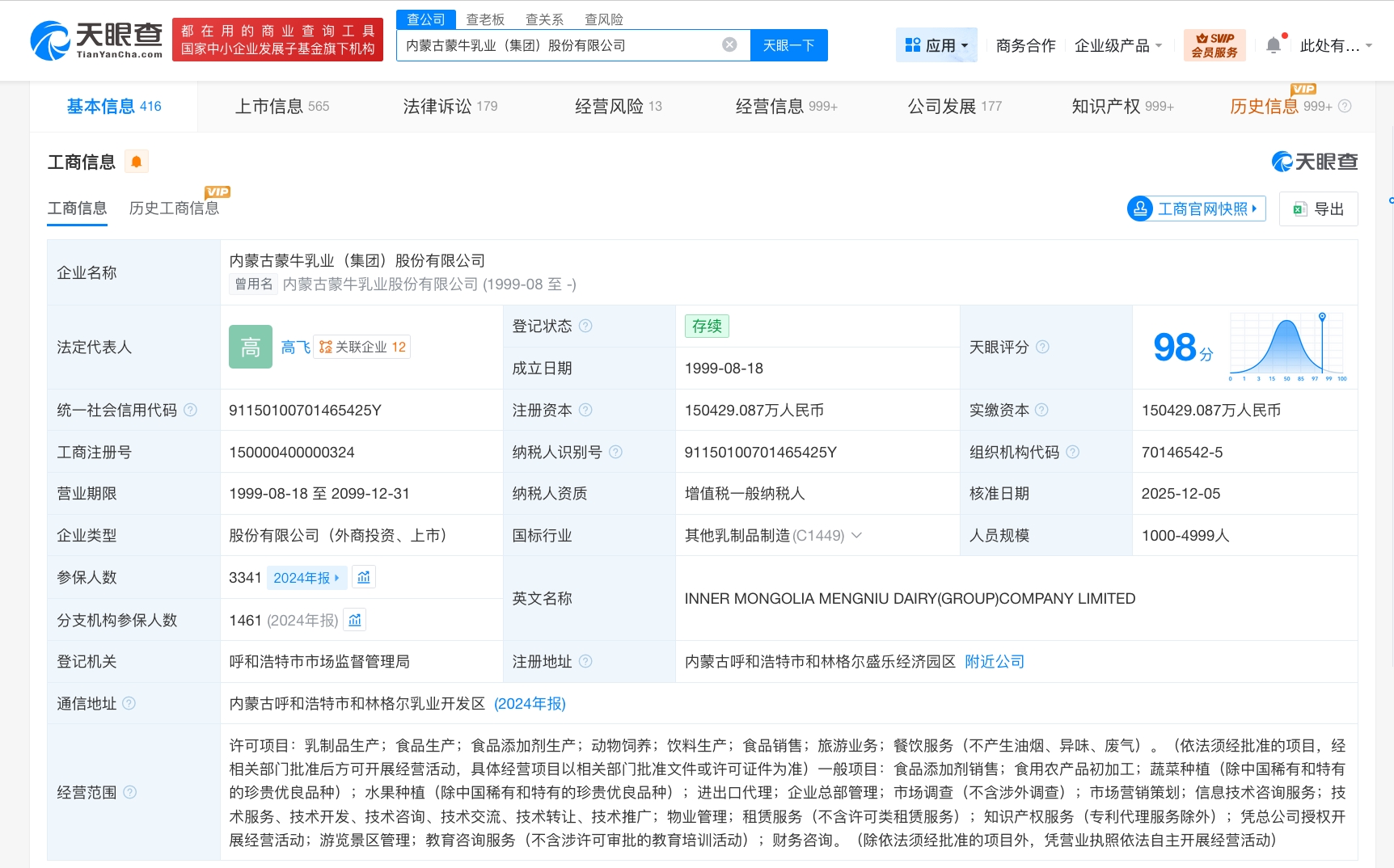 工商信息显示,内蒙古蒙牛乳业(集团)股份有限公司成立于1999年8月,法定代表人为高飞,注册资本约15亿人民币,经营范围含乳制品生产、食品生产、食品添加剂生产、动物饲养、饮料生产、食品销售等。股东信息显示,该公司由中国乳业(毛里求斯)有限公司、中国蒙牛乳业有限公司、内蒙古老牛慈善基金会等共同持股。