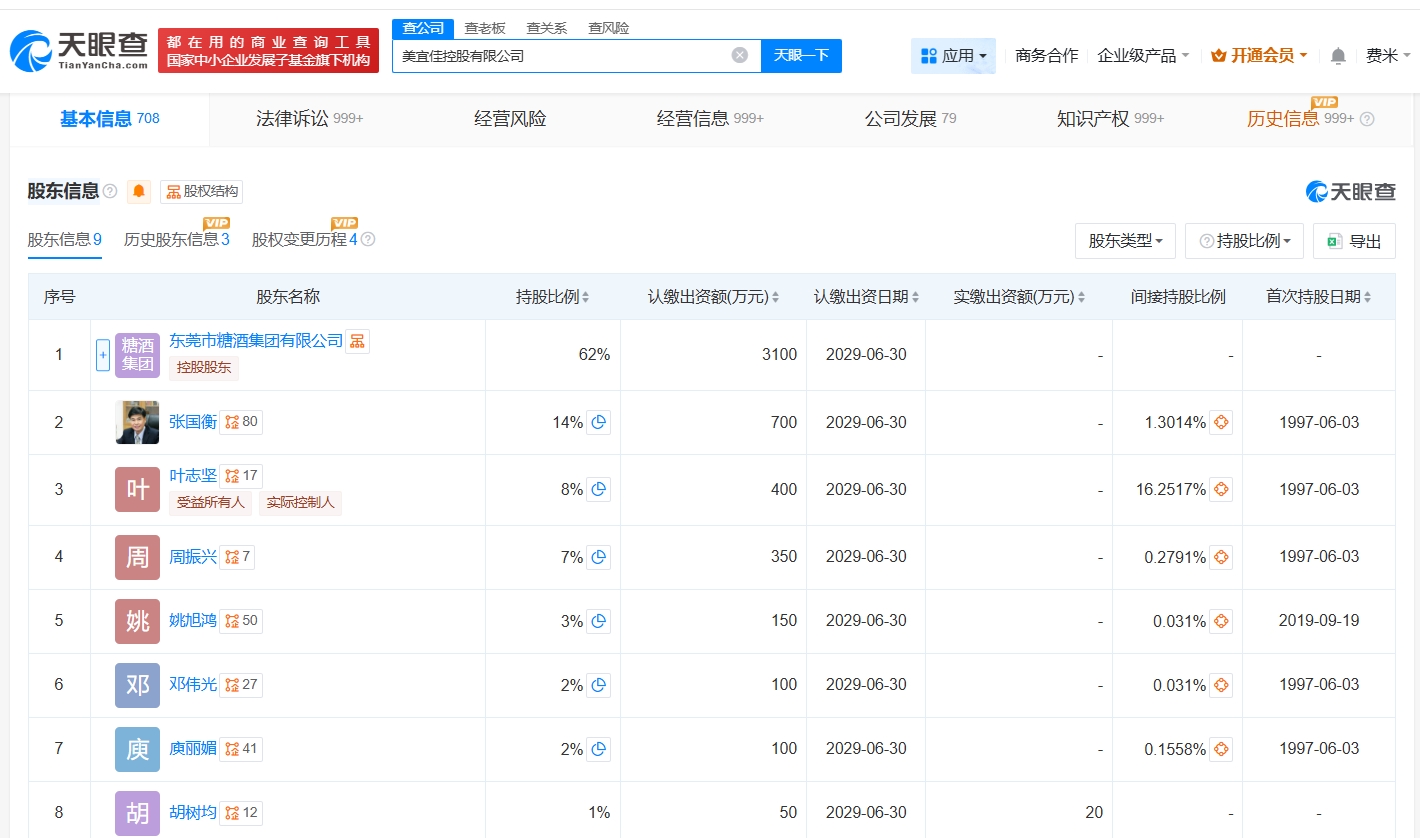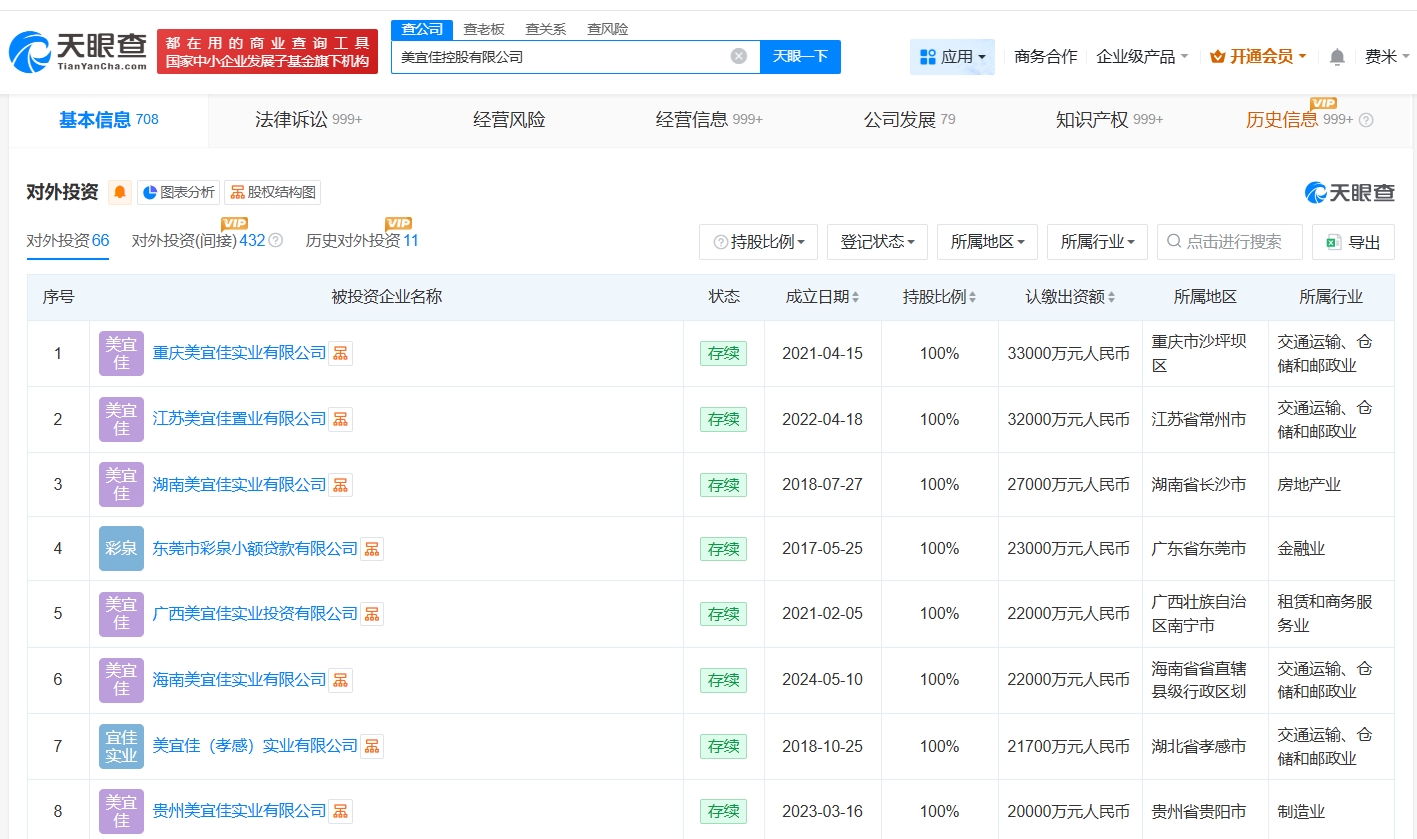 天眼查App显示,美宜佳关联公司美宜佳控股有限公司成立于1997年6月,法定代表人为张国衡,注册资本5000万人民币,经营范围包括企业总部管理、日用品销售、农副产品销售等。股东信息显示,该公司由东莞市糖酒集团有限公司、张国衡、叶志坚等共同持股。法律诉讼信息显示,该公司曾因产品责任纠纷、买卖合同纠纷等被起诉。对外投资信息显示,该公司对外投资60余家企业,其中40余家企业处于存续状态,包括重庆美宜佳实业有限公司、江苏美宜佳置业有限公司等。