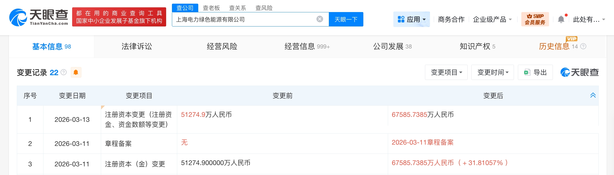 雷达财经讯,天眼查工商信息显示,近日,上海电力绿色能源有限公司发生工商变更,注册资本由约5.1亿人民币增至约6.8亿人民币,增幅约32%。