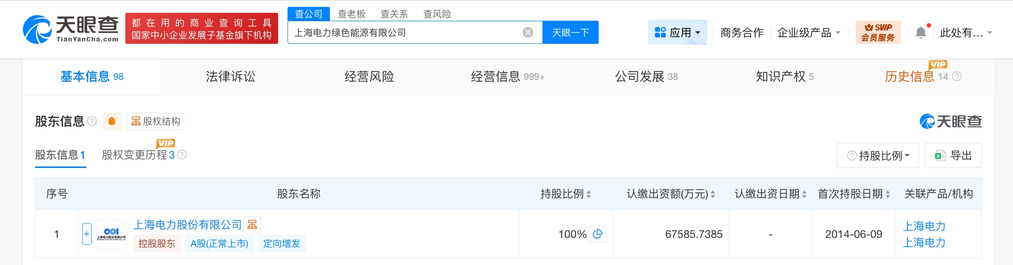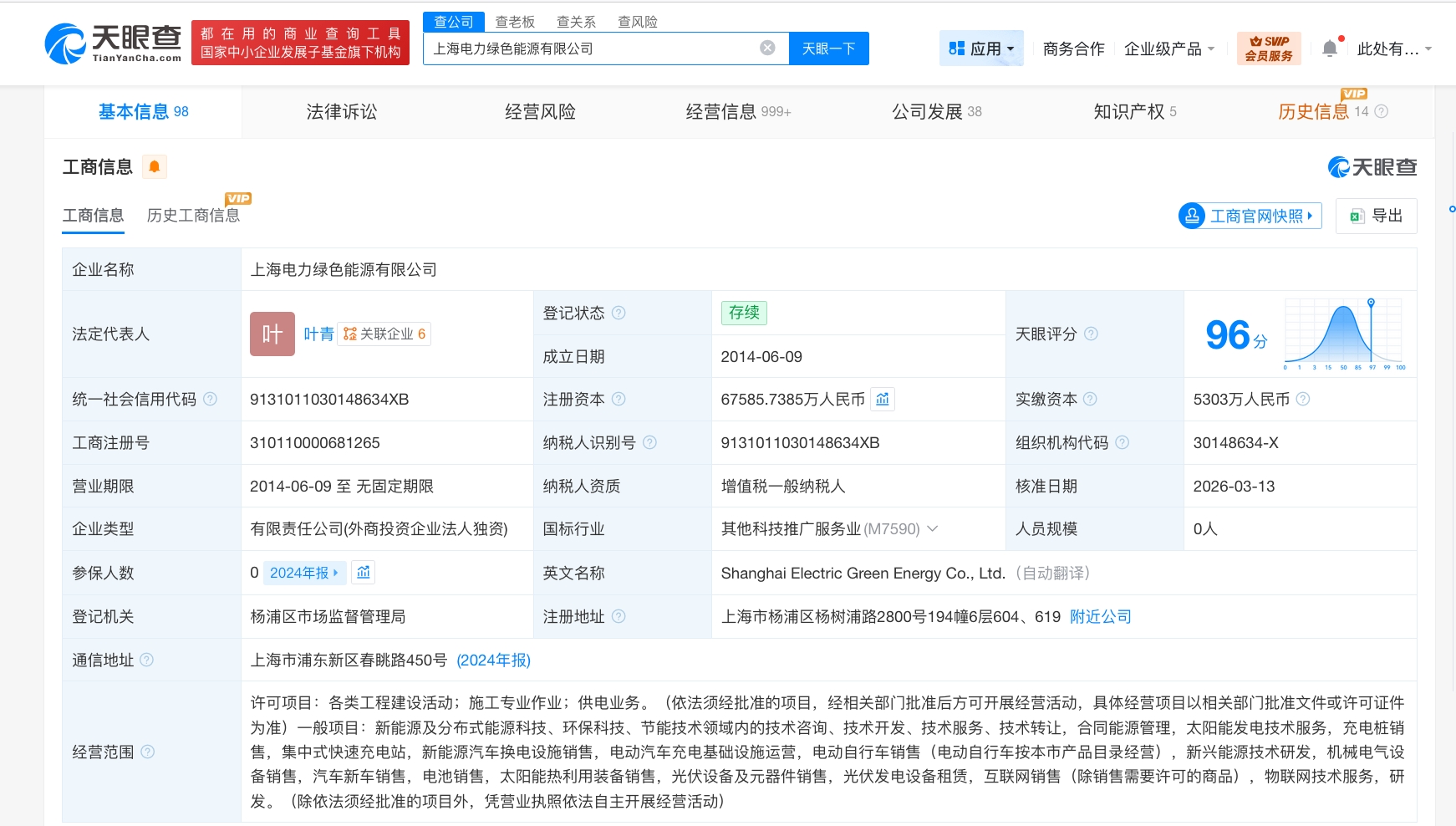 该公司成立于2014年6月,法定代表人为叶青,经营范围包括新能源及分布式能源科技、环保科技、节能技术领域内的技术咨询、技术开发、技术服务、技术转让,太阳能发电技术服务等。股东信息显示,该公司由上海电力(600021)全资持股。
