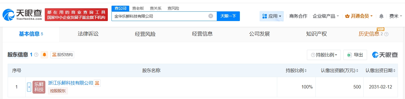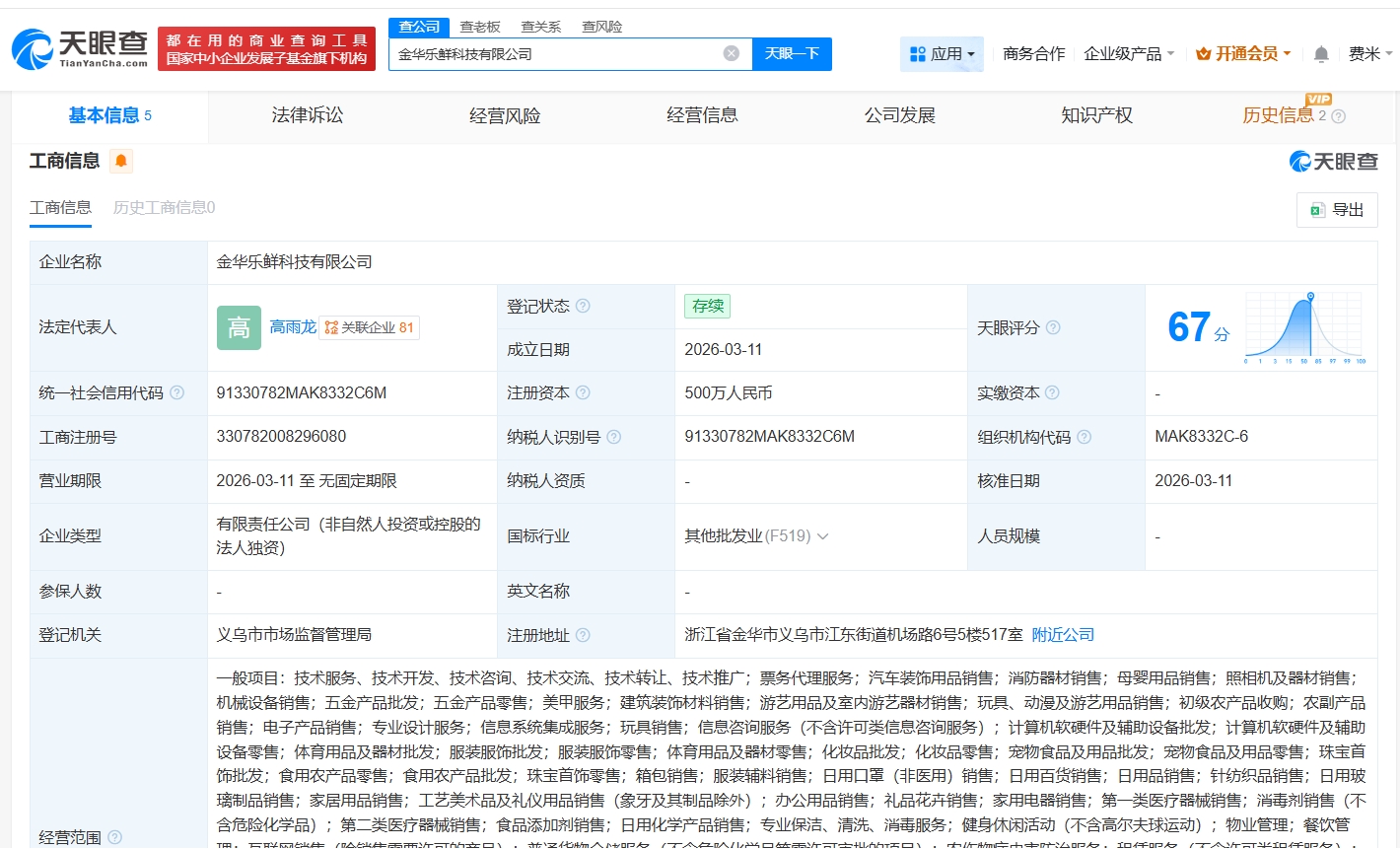 雷达财经讯,天眼查工商信息显示,近日,金华乐鲜科技有限公司成立,法定代表人为高雨龙,注册资本500万人民币,经营范围含票务代理服务、汽车装饰用品销售、消防器材销售等。股东信息显示,该公司由美团旗下浙江乐鲜科技有限公司全资持股。