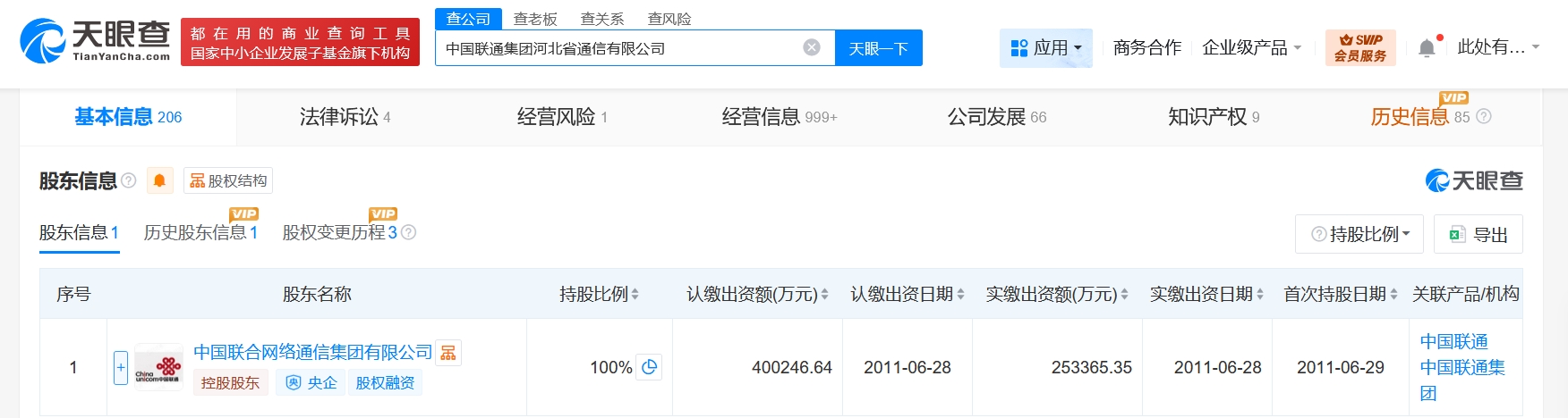 雷达财经讯,天眼查工商信息显示,近日,中国联通集团河北省通信有限公司发生工商变更,注册资本由约25.3亿人民币增至约40亿人民币,增幅约58%。