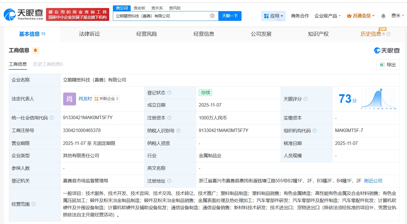 雷达财经讯,天眼查工商信息显示,近日,立顺精密科技(嘉善)有限公司成立,法定代表人为肖龙村,注册资本1000万人民币,经营范围包括塑料制品制造、有色金属铸造、高性能有色金属及合金材料销售等。股东信息显示,该公司由立讯精密(002475)旗下立铠精密科技(盐城)有限公司、重庆百钰顺精密工业股份有限公司共同持股。