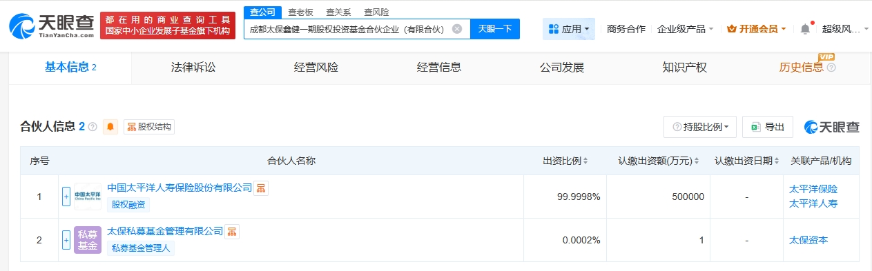 雷达财经讯,天眼查App显示,近日,成都太保鑫健一期股权投资基金合伙企业(有限合伙)成立,执行事务合伙人为太保私募基金管理有限公司,出资额约50亿人民币,经营范围包括以私募基金从事股权投资、投资管理、资产管理等活动。合伙人信息显示,该基金由中国太平洋人寿保险股份有限公司、太保私募基金管理有限公司共同出资。
