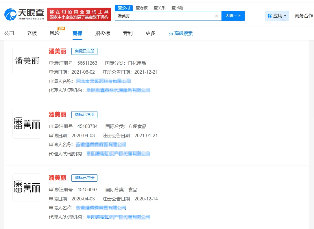 天眼查知识产权信息显示,“潘美丽”已被多方成功注册为商标,申请人包括河北某医药科技公司、安徽某商贸公司等,国际分类包括日化用品、方便食品、饲料种籽等。