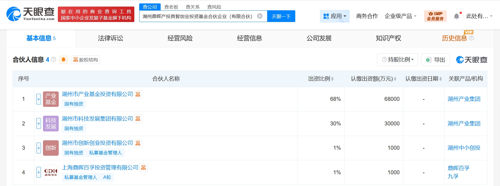 雷达财经讯,天眼查工商信息显示,近日,湖州鼎晖产投具智创业投资基金合伙企业(有限合伙)成立,执行事务合伙人为上海鼎晖百孚投资管理有限公司,出资额10亿人民币,经营范围含创业投资,以私募基金从事股权投资、投资管理、资产管理等活动。合伙人信息显示,该基金由湖州市产业基金投资有限公司、湖州市科技发展集团有限公司、湖州市创新创业投资有限公司、上海鼎晖百孚投资管理有限公司共同出资。