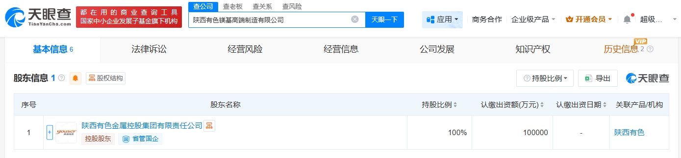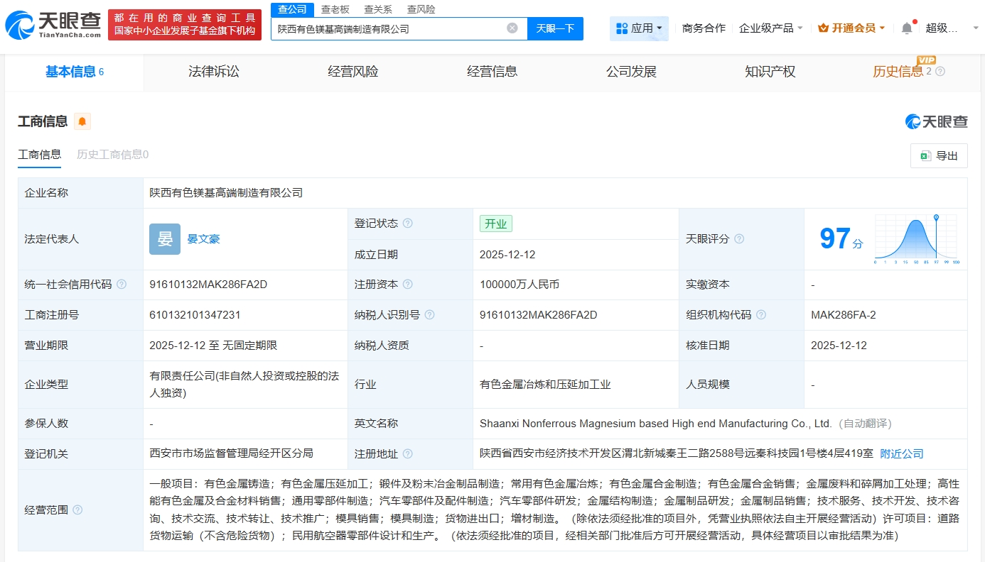 雷达财经讯,天眼查App显示,近日,陕西有色镁基高端制造有限公司成立,法定代表人为晏文豪,注册资本10亿人民币,经营范围包括有色金属铸造、有色金属压延加工、锻件及粉末冶金制品制造、常用有色金属冶炼等。股东信息显示,该公司由陕西有色金属控股集团有限责任公司全资持股。