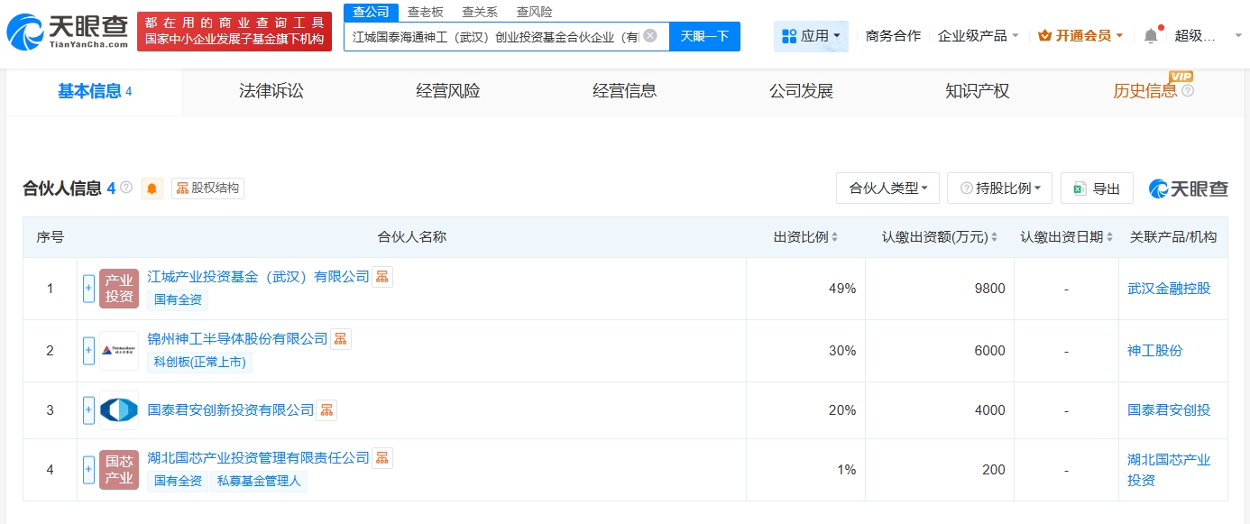 雷达财经讯,天眼查工商信息显示,近日,江城国泰海通神工(武汉)创业投资基金合伙企业(有限合伙)成立,执行事务合伙人为国泰君安创新投资有限公司,出资额2亿人民币,经营范围为私募股权投资基金管理、创业投资基金管理服务。合伙人信息显示,该基金由江城产业投资基金(武汉)有限公司、神工股份(688233)、国泰海通旗下国泰君安创新投资有限公司等共同出资。