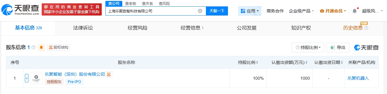 雷达财经讯,天眼查工商信息显示,近日,上海乐聚数智科技有限公司成立,法定代表人为张大鹏,注册资本1000万人民币,经营范围包括大数据服务、人工智能基础软件开发、智能机器人的研发等。股东信息显示,该公司由乐聚智能(深圳)股份有限公司全资持股。