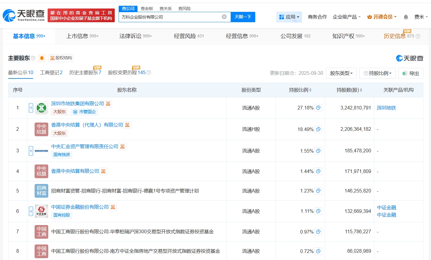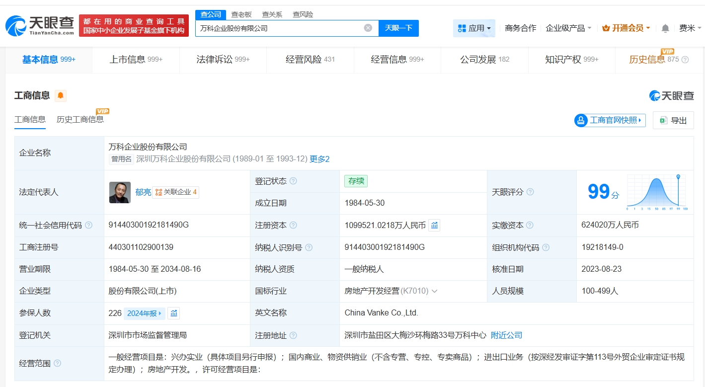 万科企业股份有限公司成立于1984年5月,法定代表人为郁亮,注册资本约110亿人民币,经营范围包括兴办实业、进出口业务、房地产开发等。股东信息显示,该公司由深圳市地铁集团有限公司、香港中央结算(代理人)有限公司、中国证券金融股份有限公司等共同持股。