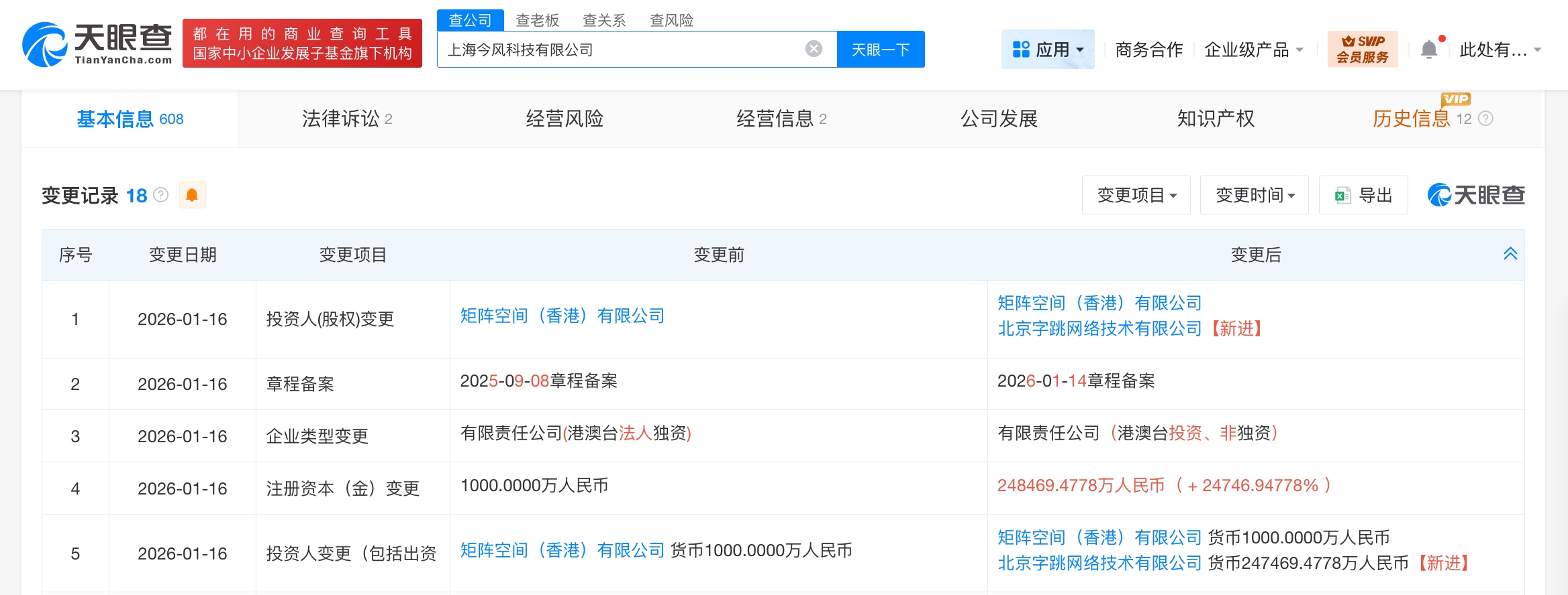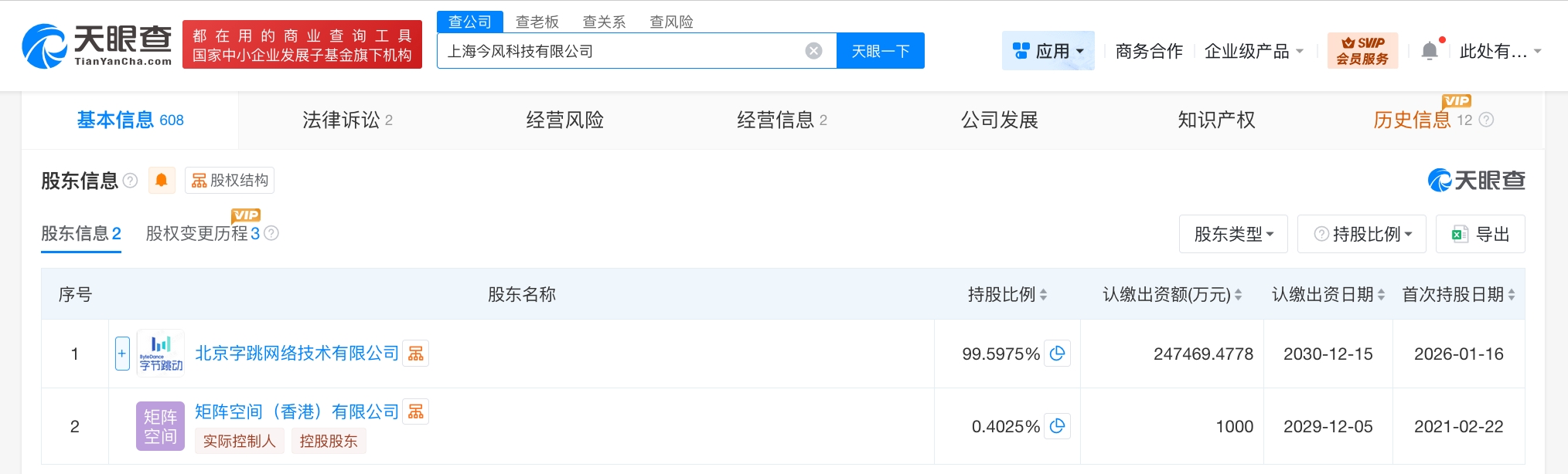 上海今风科技有限公司成立于2021年2月,法定代表人为司马拓,经营范围含网络科技领域内的技术开发、技术转让、技术服务、技术推广、技术咨询,软件开发,数据处理和存储支持服务,房地产开发经营等。股东信息显示,该公司现由北京字跳网络技术有限公司、矩阵空间(香港)有限公司共同持股。