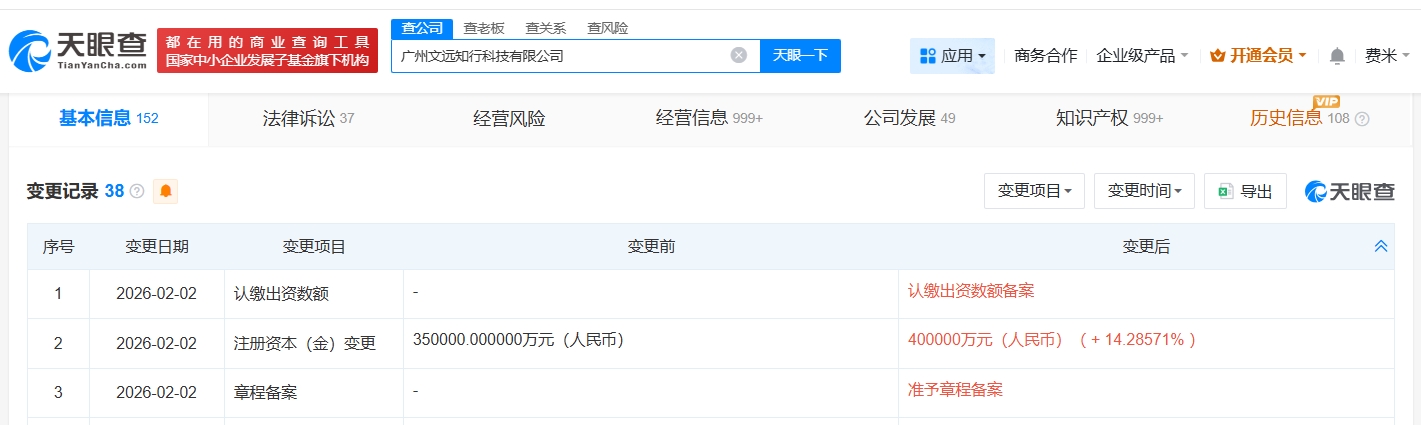 雷达财经讯,天眼查App显示,近日,广州文远知行科技有限公司发生工商变更,注册资本由35亿人民币增至40亿人民币,增幅约14%。