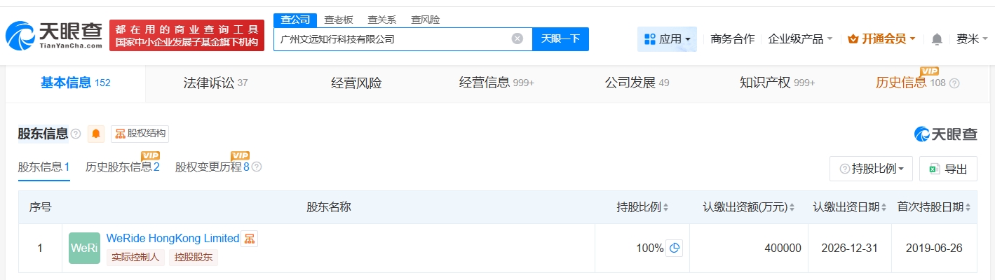 广州文远知行科技有限公司成立于2018年1月,法定代表人为韩旭,经营范围包括物联网技术研发、人工智能基础软件开发、人工智能应用软件开发等。股东信息显示,该公司由WeRide HongKong Limited全资持股。