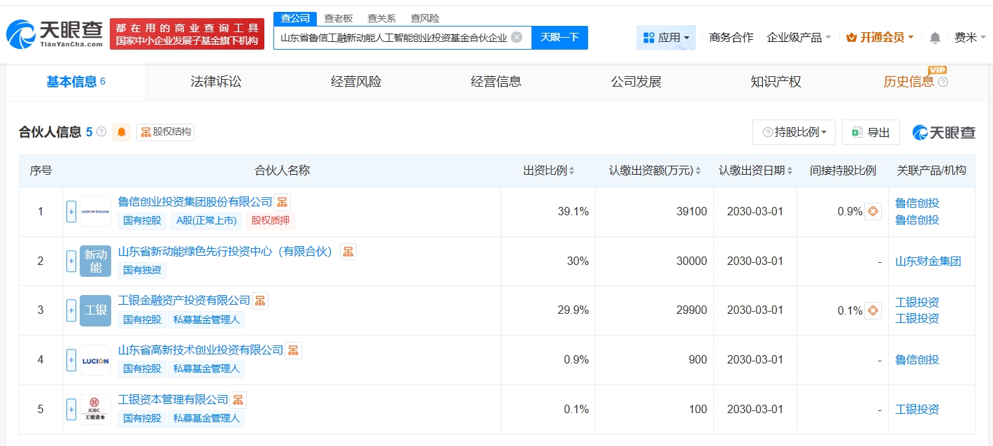 雷达财经讯,天眼查App显示,近日,山东省鲁信工融新动能人工智能创业投资基金合伙企业(有限合伙)成立,执行事务合伙人为工银资本管理有限公司、山东省高新技术创业投资有限公司,出资额10亿人民币,经营范围为私募股权投资基金管理、创业投资基金管理服务,由鲁信创投(600783)、山东省新动能绿色先行投资中心(有限合伙)、工银金融资产投资有限公司等共同出资。