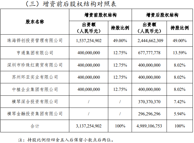 横琴人寿初始注册资本为20亿元,由珠海铧创投资管理有限公司(简称“珠海铧创”)、亨通集团有限公司、广东明珠集团深圳投资有限公司、苏州环亚实业有限公司、中植企业集团有限公司5家公司共同发起设立,5家股东持股比例均为20%。